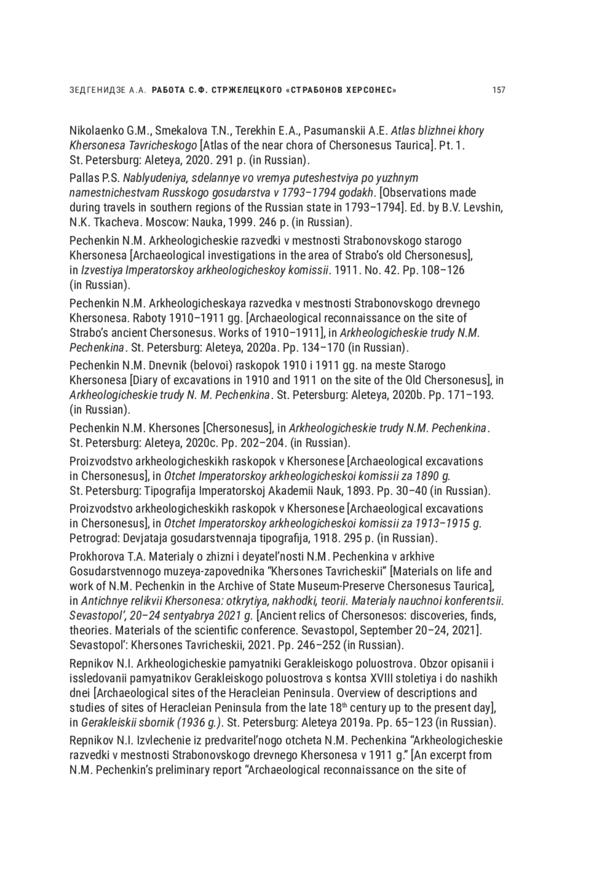 92. Pechenkin N.M. Arkheologicheskaya razvedka v mestnosti Strabonovskogo drevnego Khersonesa. Raboty 1910-1911 gg. [Archaeological reconnaissance on the site of Strabo’s ancient Chersonesus. Works of 1910-1911], in Arkheologicheskie trudy N.M. Pechenkina. St. Petersburg: Aleteya, 2020a. Pp. 134-170 (in Russian).