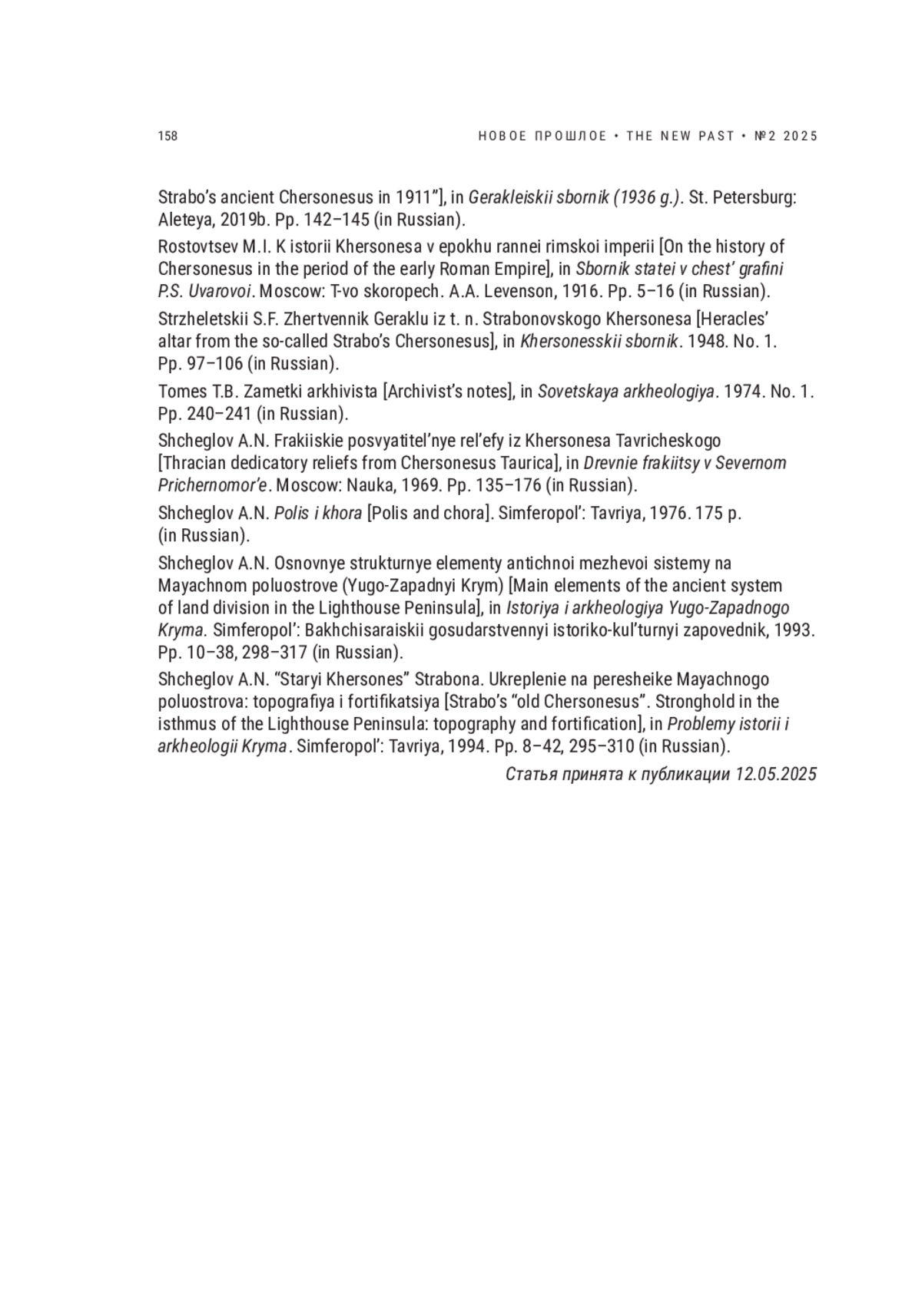 94. Pechenkin N.M. Khersones [Chersonesus], in Arkheologicheskie trudy N.M. Pechenkina. St. Petersburg: Aleteya, 2020c. Pp. 202-204. (in Russian).