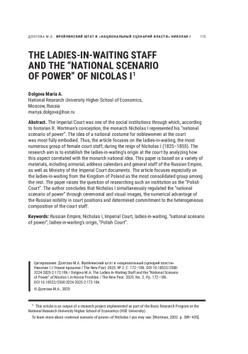 Российский императорский двор — это один из социальных институтов, через посредство которого, согласно концепции Р. Уортмана, в период правления Николая I был реализован «национальный сценарий власти». Именно в придворной среде наиболее полно воплотилась идея о национальном костюме для дворян и «русском платье» для придворных дам. Целью статьи является установление этнического происхождения фрейлин, самой многочисленной группы среди женских должностей при дворе Николая I, и соотношение этого аспекта с национальным дискурсом монарха. На основе справочных материалов (гербовники, адрес-календари и общий штат Российской империи) и документооборота Министерства императорского двора (фонды Российского государственного исторического архива) было определено число фрейлин, пожалованных на придворную должность в период правления императора Николая I. Особое внимание обращено на фрейлин из Царства Польского как наиболее обособленную и консолидированную группу по отношению к остальным дворянкам при российском императорском дворе. В статье ставится вопрос об исследовании такого института, как «польский двор». Проведенное исследование показало, что Николай I регламентировал «национальный сценарий власти» через церемониал, визуальные образы и численное преимущество русского дворянства при назначении на придворные должности, а также проявил приверженность к гетерогенному по происхождению составу придворного штата.
