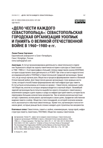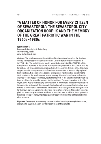 В статье проанализирована деятельность севастопольского отделения Украинского общества охраны памятников истории и культуры в Севастополе в 1960–1980-е гг. В историографии в большей степени представлен анализ ВООПИиК, которое осуществляло свою деятельность в РСФСР. При этом остается недостаточно исследованной работа УООПИиК и Севастопольской городской организации. Кроме того, не до конца изучена роль Общества в процессе формирования памяти о Великой Отечественной войне. Для Севастополя данная организация стала важным институтом, который способствовал формированию местной инфраструктуры памяти. В статье были использованы источники из архива г. Севастополя, связанные с работой Общества, многие из которых впервые вводятся в научный оборот. Важнейшей задачей организации была попытка выработки нового отношения к памятникам и вовлечения граждан в дело охраны и ухода за инфраструктурой памяти, которая была перегружена большим количеством монументов. Тем не менее различные местные акторы стремились использовать организацию в своих целях, продвигая собственное видение памяти о войне. Общество стало площадкой, на которой получили возможность высказаться и обычные севастопольцы. Кроме того, организация стала источником денег, которые раньше было сложно находить для строительства монументов