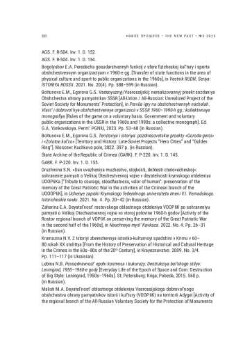 82. Boltunova E.M., Egorova G.S. Vsesoyuznyj/Vserossijskij: nerealizovannyj proekt sozdaniya Obshchestva ohrany pamyatnikov SSSR [All-Union / All-Russian: Unrealized Project of the Soviet Society for Monuments’ Protection], in Pravila igry na obshchestvennyh nachalah. Vlast’ i dobrovol’nye obshchestvennye organizacii v SSSR 1960-1990-h gg.: kollektivnaya monografiya [Rules of the game on a voluntary basis. Government and voluntary public organizations in the USSR in the 1960s and 1990s: a collective monograph]. Ed. G.A. Yankovskaya. Perm’: PGNIU, 2023. Pp. 53-68 (in Russian).