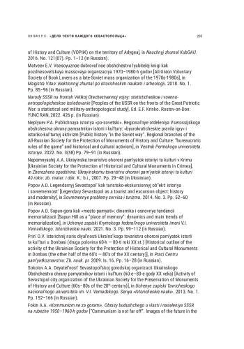 98. Sokolov A.A. Deyatel’nost’ Sevastopol’skoj gorodskoj organizacii Ukrainskogo Obshchestva ohrany pamyatnikov istorii i kul’tury (60 e-80 e gody XX veka) [Activity of Sevastopol city organization of the Ukrainian Society for the Preservation of Monuments of History and Culture (60s-80s of the 20th century)], in Uchenye zapiski Tavricheskogo nacional’nogo universiteta im. V.I. Vernadskogo. Seriya “Istoricheskie nauki”. 2013. No. 1. Pp. 152-166 (in Russian).