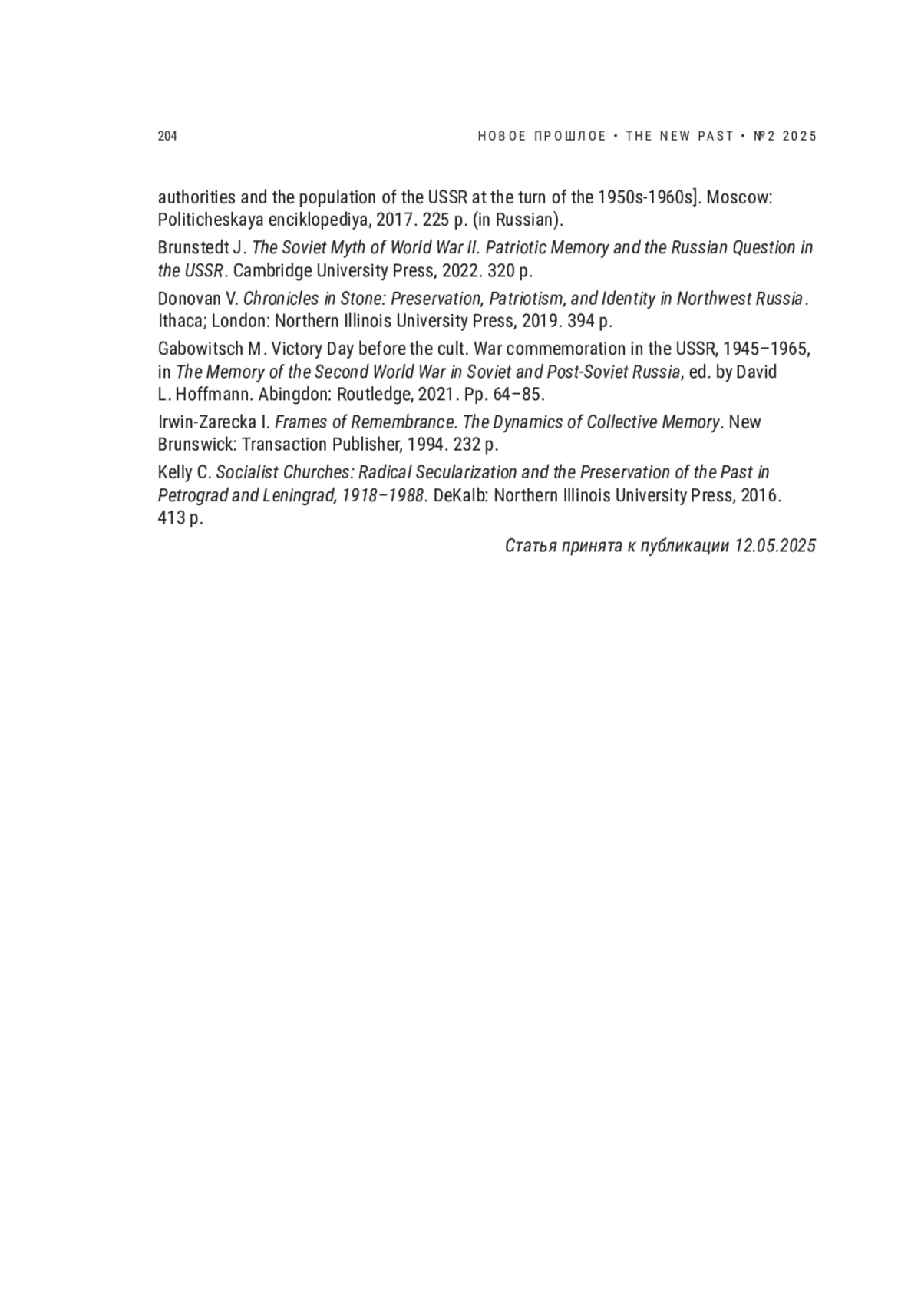 50. Gabowitsch M. Victory Day before the cult. War commemoration in the USSR, 1945-1965 // The Memory of the Second World War in Soviet and Post-Soviet Russia. Ed. David L. Hoffmann. Abingdon: Routledge, 2021. Pp. 64-85.