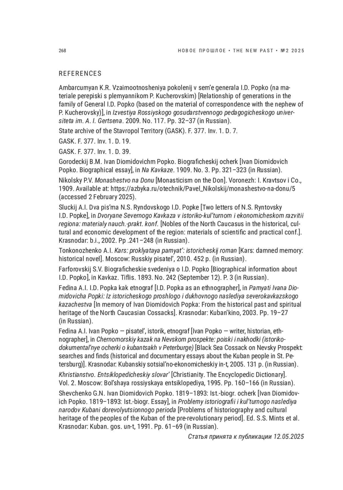 1. Амбарцумян К.Р. Взаимоотношения поколений в семье генерала И.Д. Попко (на материале переписки с племянником П. Кучеровским) // Известия Российского государственного педагогического университета им. А.И. Герцена. 2009. № 117. С. 32-37. EDN: KVATOP