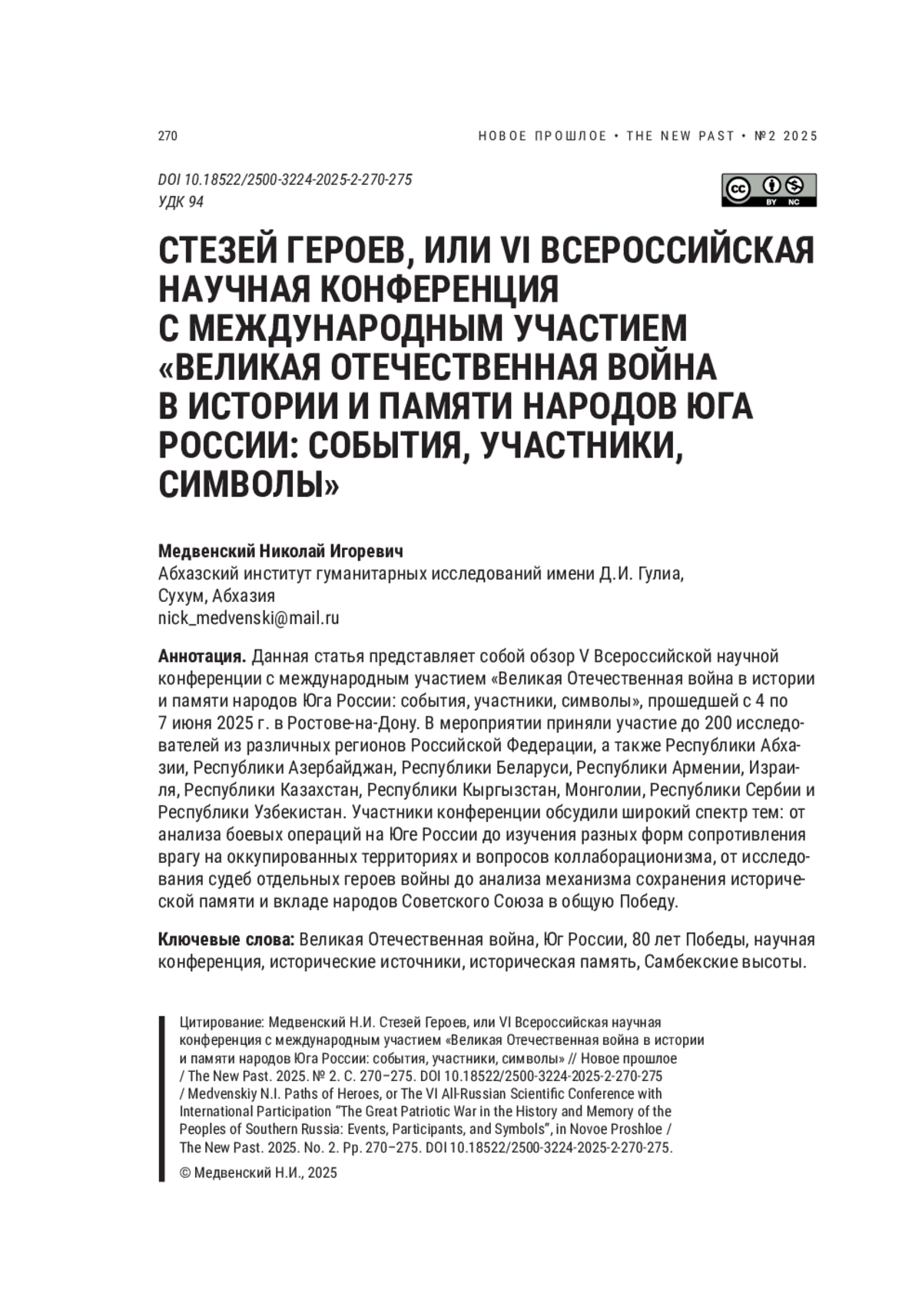 Данная статья представляет собой обзор V Всероссийской научной конференции с международным участием «Великая Отечественная война в истории и памяти народов Юга России: события, участники, символы», прошедшей с 4 по 7 июня 2025 г. в Ростове-на-Дону. В мероприятии приняли участие до 200 исследователей из различных регионов Российской Федерации, а также Республики Абхазии, Республики Азербайджан, Республики Беларуси, Республики Армении, Израиля, Республики Казахстан, Республики Кыргызстан, Монголии, Республики Сербии и Республики Узбекистан. Участники конференции обсудили широкий спектр тем: от анализа боевых операций на Юге России до изучения разных форм сопротивления врагу на оккупированных территориях и вопросов коллаборационизма, от исследования судеб отдельных героев войны до анализа механизма сохранения исторической памяти и вкладе народов Советского Союза в общую Победу.