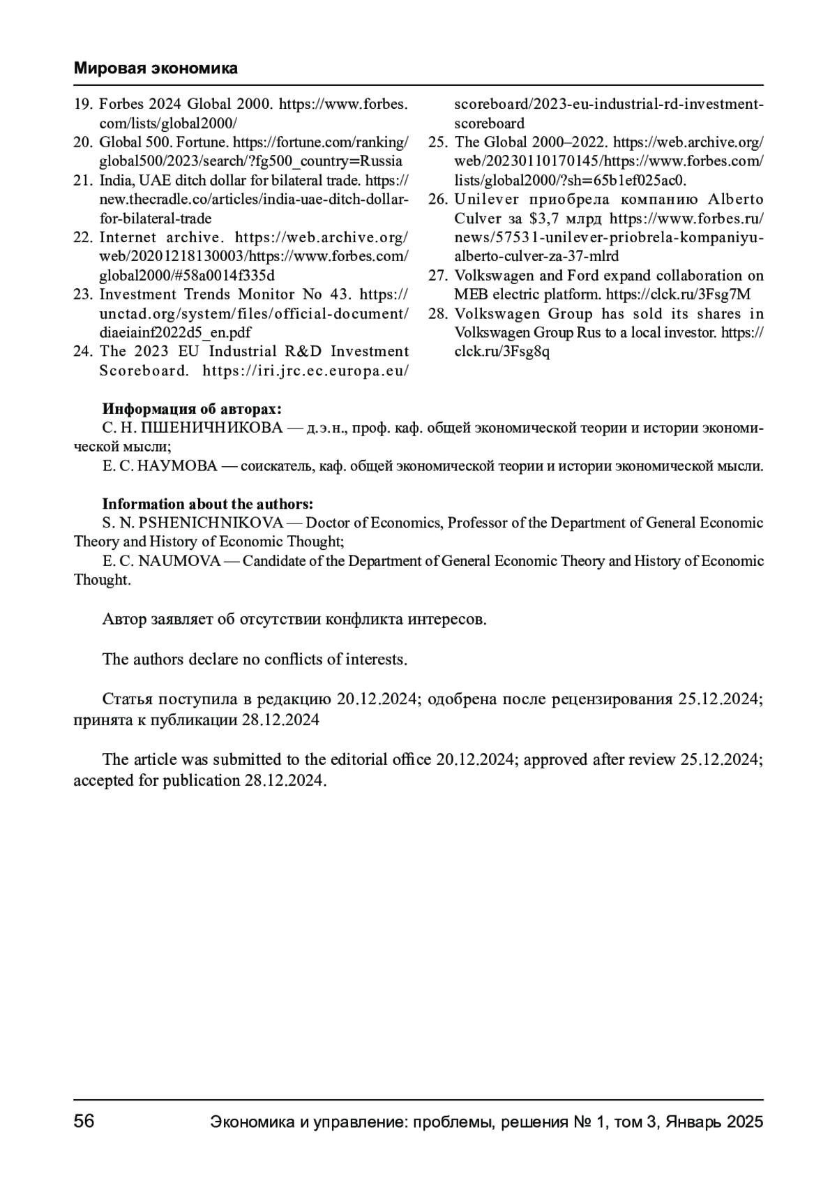 13. Родионова И. А., Дирин Д. А. Крупнейшие транснациональные корпорации мира: сдвиги в страновой и секторальной принадлежности // Географический вестник. 2023. № 1. С. 52-71. EDN: LWOZKF