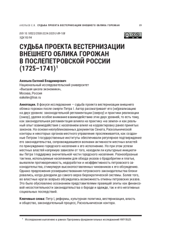 О петровском проекте вестернизации внешнего облика горожан написано немало [см.: Есипов, 1863; Михневич, 1882; Hughes, 2004; Аваков, 2017; Акельев, 2022]. Однако до сих пор почти не исследована судьба этого начинания после того, как в конце января 1725 г. Петр I отошел в мир иной. Между тем рассмотрение этого вопроса представляет особенный интерес для изучения механизмов сохранения его наследия в построенной им империи. Был ли Петр I единственным источником и движущей силой радикальных культурных преобразований? Сохраняли ли ближайшие политические преемники первого российского императора верность его идеям не только на словах, но и на деле? Какую роль в реализации его культурной программы играли созданные им государственные институты? Наконец, каковы были результаты его культурной политики в долгосрочной перспективе?