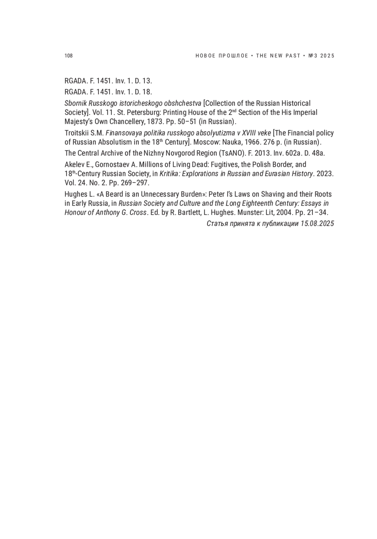 41. Akelev E., Gornostaev A. Millions of Living Dead: Fugitives, the Polish Border, and 18th-Century Russian Society // Kritika: Explorations in Russian and Eurasian History. 2023. Vol. 24. No. 2. Pp. 269-297.