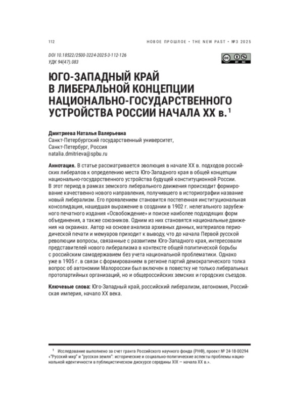 ДМИТРИЕВА Н. В. ЮГО-ЗАПАДНЫЙ КРАЙ В ЛИБЕРАЛЬНОЙ КОНЦЕПЦИИ НАЦИОНАЛЬНО-ГОСУДАРСТВЕННОГО УСТРОЙСТВА РОССИИ НАЧАЛА XX В // НОВОЕ ПРОШЛОЕ. 2025. № 3