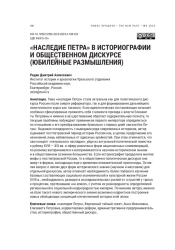 Тема «наследия Петра» стала актуальна как для политического дискурса России после смерти реформатора, так и для формирования дальнейшего политического курса как такового. Если идеологическая составляющая начинает особенно сфокусировано проявлять себя с момента прихода к власти Елизаветы Петровны и именно в ее царствование обретает содержательную полноту, то текущие проблемы побуждают преемников первого императора определиться по отношению к его преобразованиям буквально с первых дней «жизни без Петра». Выражая солидарность с выводами ряда современных историков, автор оценивает постпетровский период истории России как, в целом, продолжение его начинаний, лишь избавленных от одиозных крайностей. При этом отмечается, что сам концепт «петровского наследия», уйдя из актуальной политической повестки к рубежу XVIII — XIX вв. в сферу различных форм национальных коммемораций, по-разному воспринимался и воспринимается в научном историческом знании и в общественном сознании большинства. Если историография преодолела многие мифы о постпетровской России, то в общественно-политическом дискурсе они живут в формах, восходящих еще к временам елизаветинской пропаганды. Оставляя вопрос о связях двух форм исторического знания (научном и массовом) для отдельной дискуссии, автор отмечает необходимость более глубокого изучения базовых составляющих социально-экономической и культурной жизни России XVIII в., необходимость разворота исследовательских усилий от «страстей у трона» к процессам, протекавшим «на земле», с учетом их разнородности, определяемой региональной и социальной неоднородностью империи. По мнению автора, именно на базе такого нового эмпирического знания возможно корректное построение новых обобщающих концепций отечественной истории этой эпохи