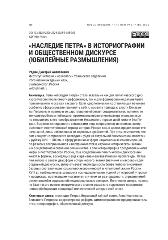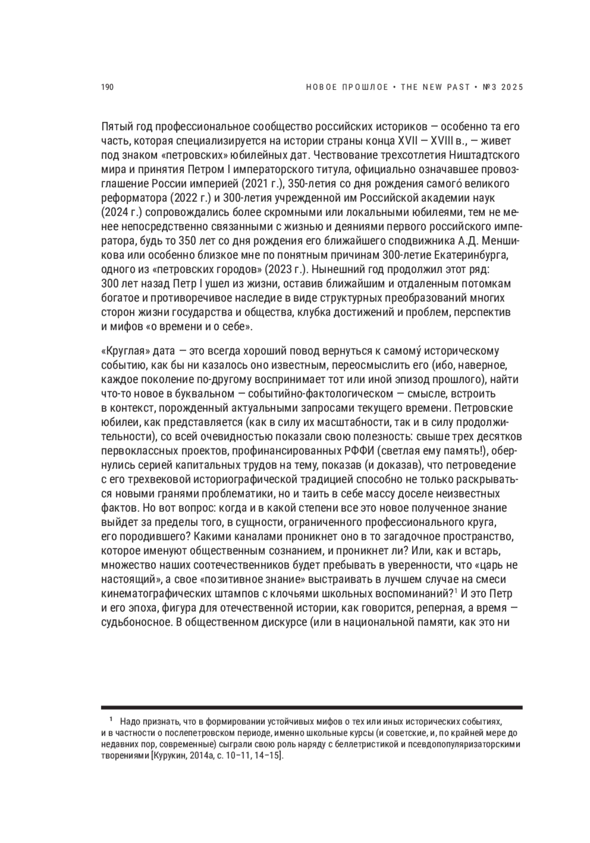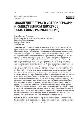 Пятый год профессиональное сообщество российских историков — особенно та его часть, которая специализируется на истории страны конца XVII — XVIII в., — живет под знаком «петровских» юбилейных дат. Чествование трехсотлетия Ништадтского мира и принятия Петром I императорского титула, официально означавшее провозглашение России империей (2021 г.), 350-летия со дня рождения самогό великого реформатора (2022 г.) и 300-летия учрежденной им Российской академии наук (2024 г.) сопровождались более скромными или локальными юбилеями, тем не менее непосредственно связанными с жизнью и деяниями первого российского императора, будь то 350 лет со дня рождения его ближайшего сподвижника А. Д. Меншикова или особенно близкое мне по понятным причинам 300-летие Екатеринбурга, одного из «петровских городов» (2023 г.). Нынешний год продолжил этот ряд: 300 лет назад Петр I ушел из жизни, оставив ближайшим и отдаленным потомкам богатое и противоречивое наследие в виде структурных преобразований многих сторон жизни государства и общества, клубка достижений и проблем, перспектив и мифов «о времени и о себе»