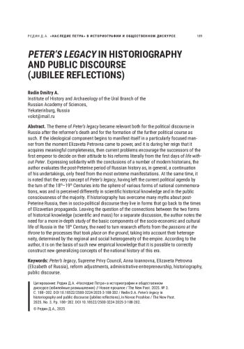 3. Багдасарян В.Э., Реснянский С.И. Образ Петра I в современном историографическом и общественном дискурсе // Вестник РУДН. Сер.: История России. 2022. Т. 21. № 3. С. 351-352.
