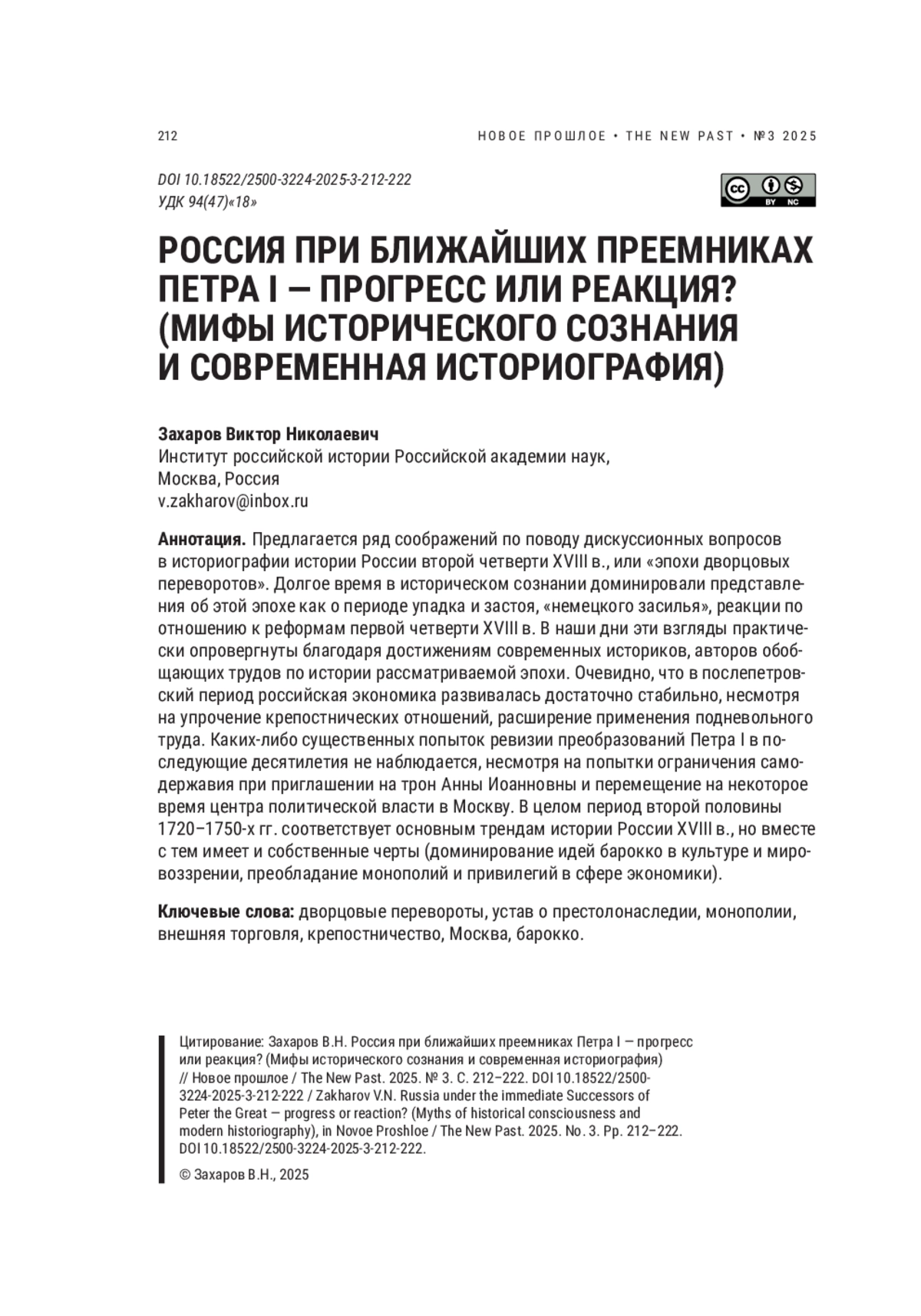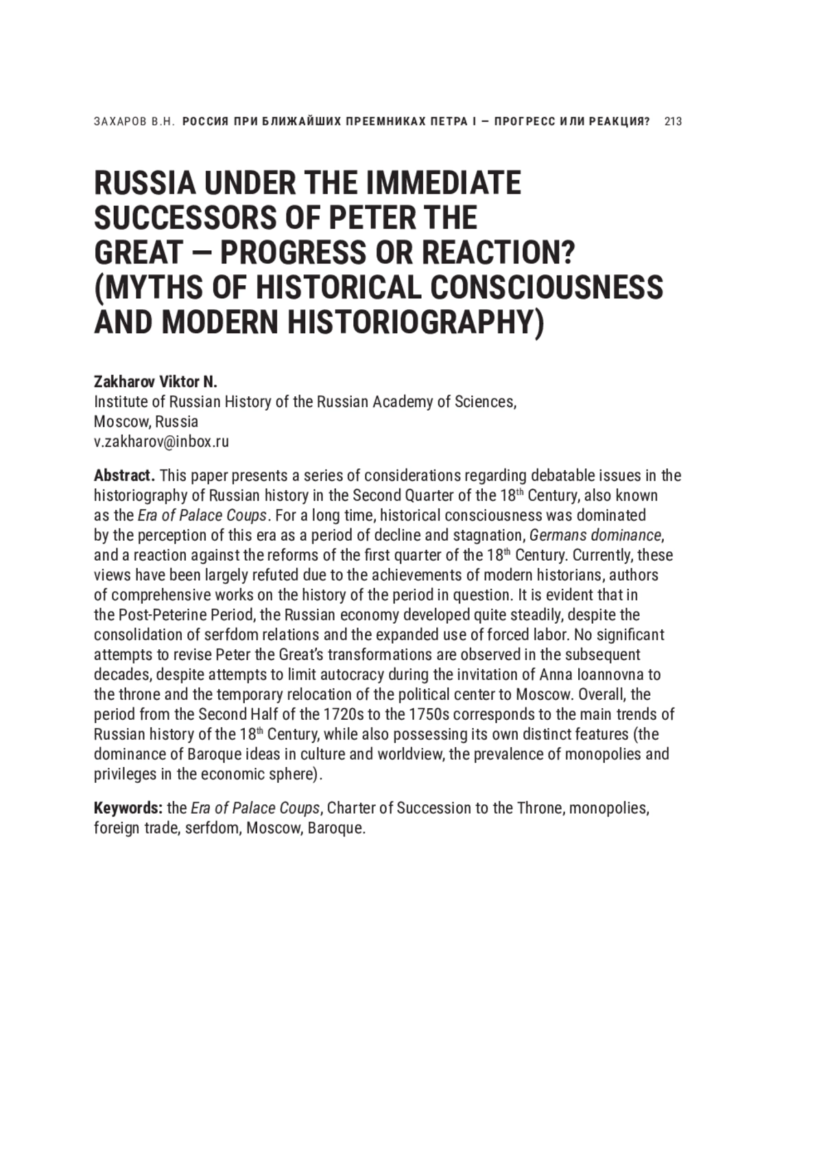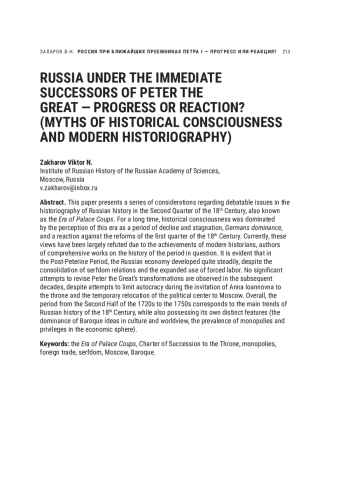 Тема «наследия Петра» стала актуальна как для политического дискурса России после смерти реформатора, так и для формирования дальнейшего политического курса как такового. Если идеологическая составляющая начинает особенно сфокусировано проявлять себя с момента прихода к власти Елизаветы Петровны и именно в ее царствование обретает содержательную полноту, то текущие проблемы побуждают преемников первого императора определиться по отношению к его преобразованиям буквально с первых дней «жизни без Петра». Выражая солидарность с выводами ряда современных историков, автор оценивает постпетровский период истории России как, в целом, продолжение его начинаний, лишь избавленных от одиозных крайностей. При этом отмечается, что сам концепт «петровского наследия», уйдя из актуальной политической повестки к рубежу XVIII — XIX вв. в сферу различных форм национальных коммемораций, по-разному воспринимался и воспринимается в научном историческом знании и в общественном сознании большинства. Если историография преодолела многие мифы о постпетровской России, то в общественно-политическом дискурсе они живут в формах, восходящих еще к временам елизаветинской пропаганды. Оставляя вопрос о связях двух форм исторического знания (научном и массовом) для отдельной дискуссии, автор отмечает необходимость более глубокого изучения базовых составляющих социально-экономической и культурной жизни России XVIII в., необходимость разворота исследовательских усилий от «страстей у трона» к процессам, протекавшим «на земле», с учетом их разнородности, определяемой региональной и социальной неоднородностью империи. По мнению автора, именно на базе такого нового эмпирического знания возможно корректное построение новых обобщающих концепций отечественной истории этой эпохи