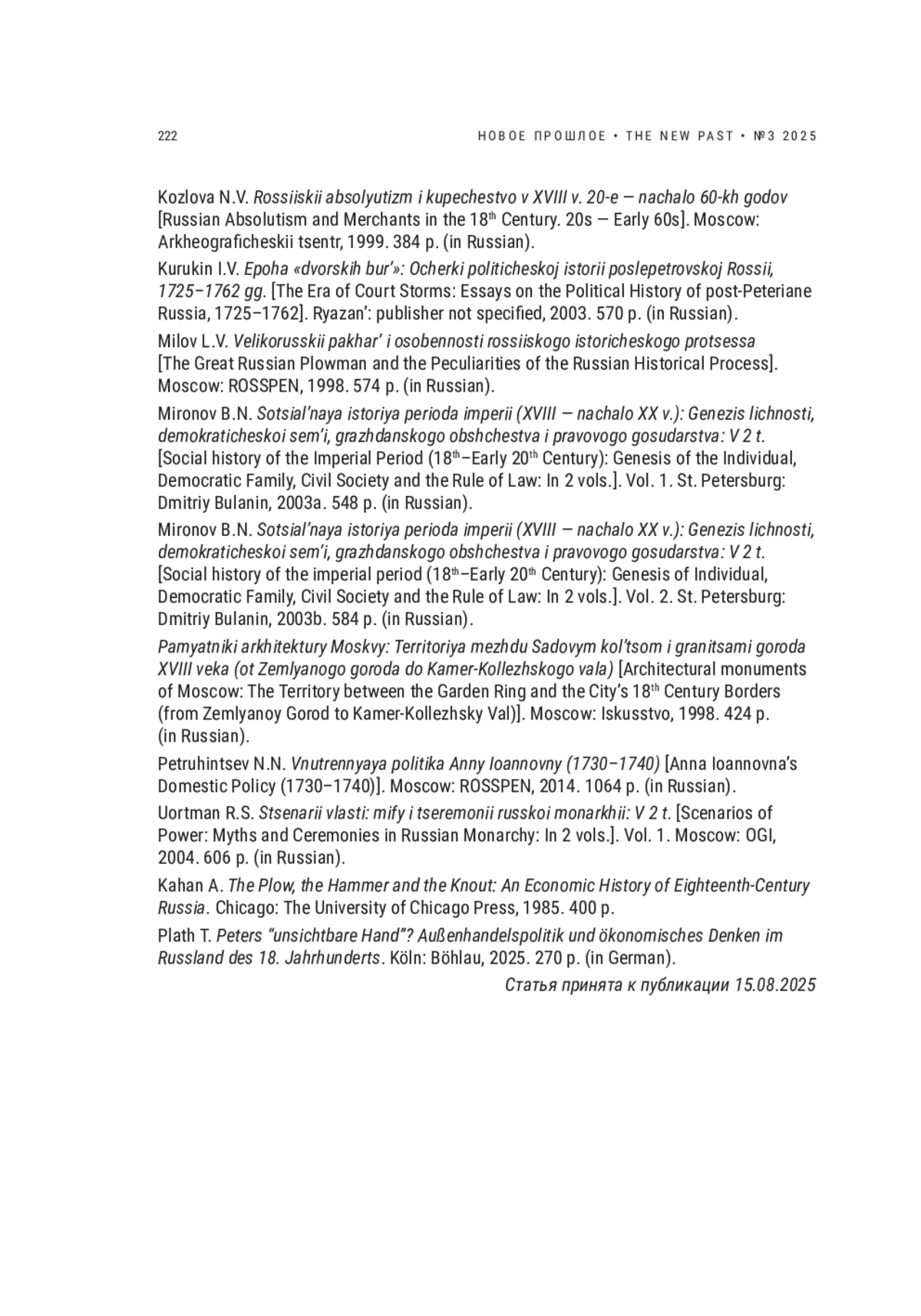 18. Plath T. Peters «unsichtbare Hand»? Außenhandelspolitik und ökonomisches Denken im Russland des 18. Jahrhunderts. Köln: Böhlau, 2025. 270 p.