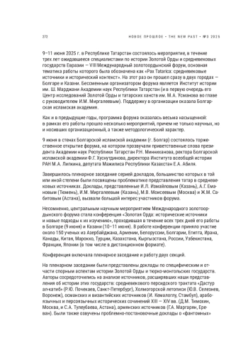 9–11 июня 2025 г. в Республике Татарстан состоялось мероприятие, в течение трех лет ожидавшееся специалистами по истории Золотой Орды и средневековых государств Евразии — VIII Международный золотоордынский форум, основная тематика работы которого была обозначена как «Pax Tatarica: средневековые источники и исторический контекст». На этот раз он прошел сразу в двух городах — Болгаре и Казани. Бессменным организатором форума является Институт истории им. Ш. Марджани Академии наук Республики Татарстан (и в первую очередь его Центр исследований Золотой Орды и татарских ханств им. М. А. Усманова во главе с руководителем И. М. Миргалеевым). Поддержку в организации оказала Болгарская исламская академия