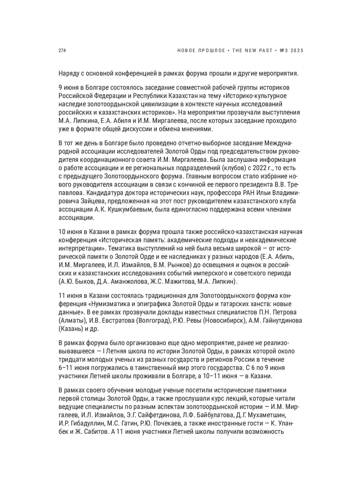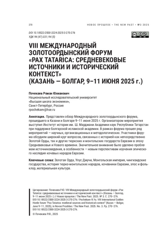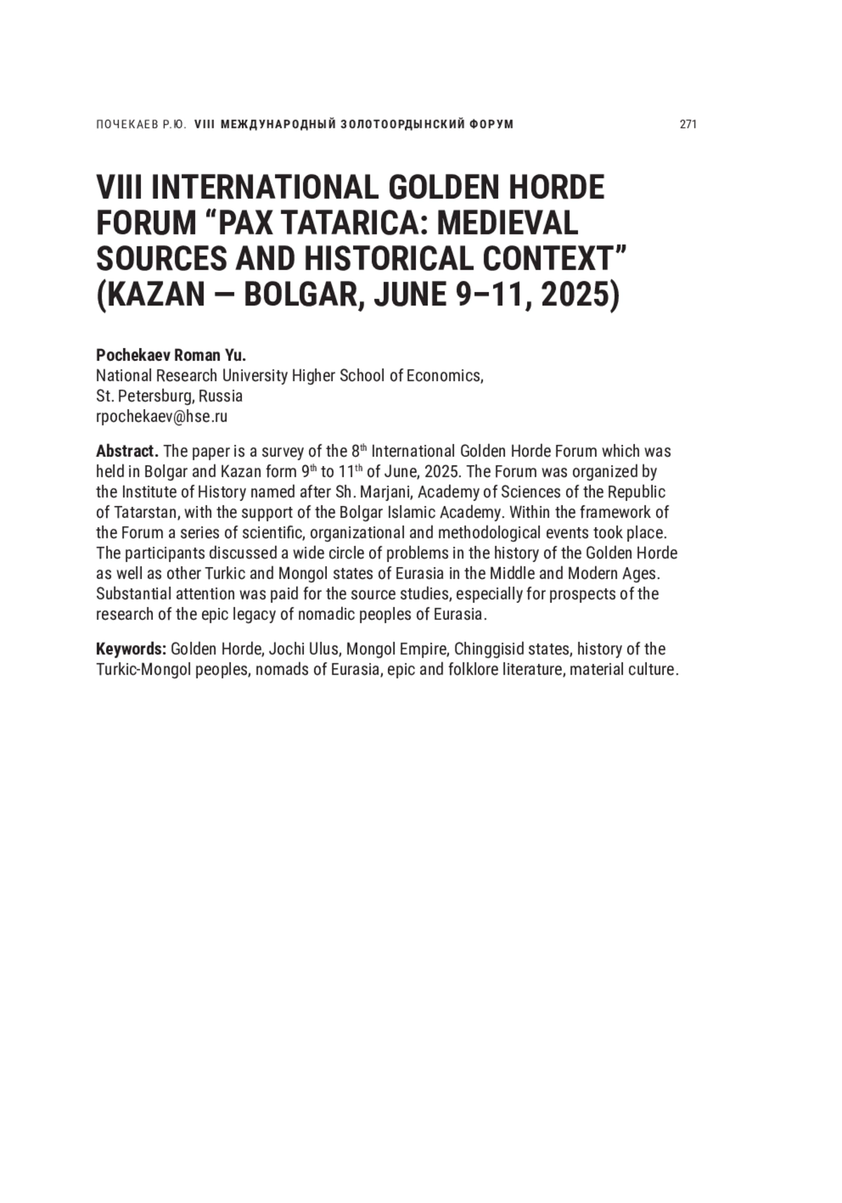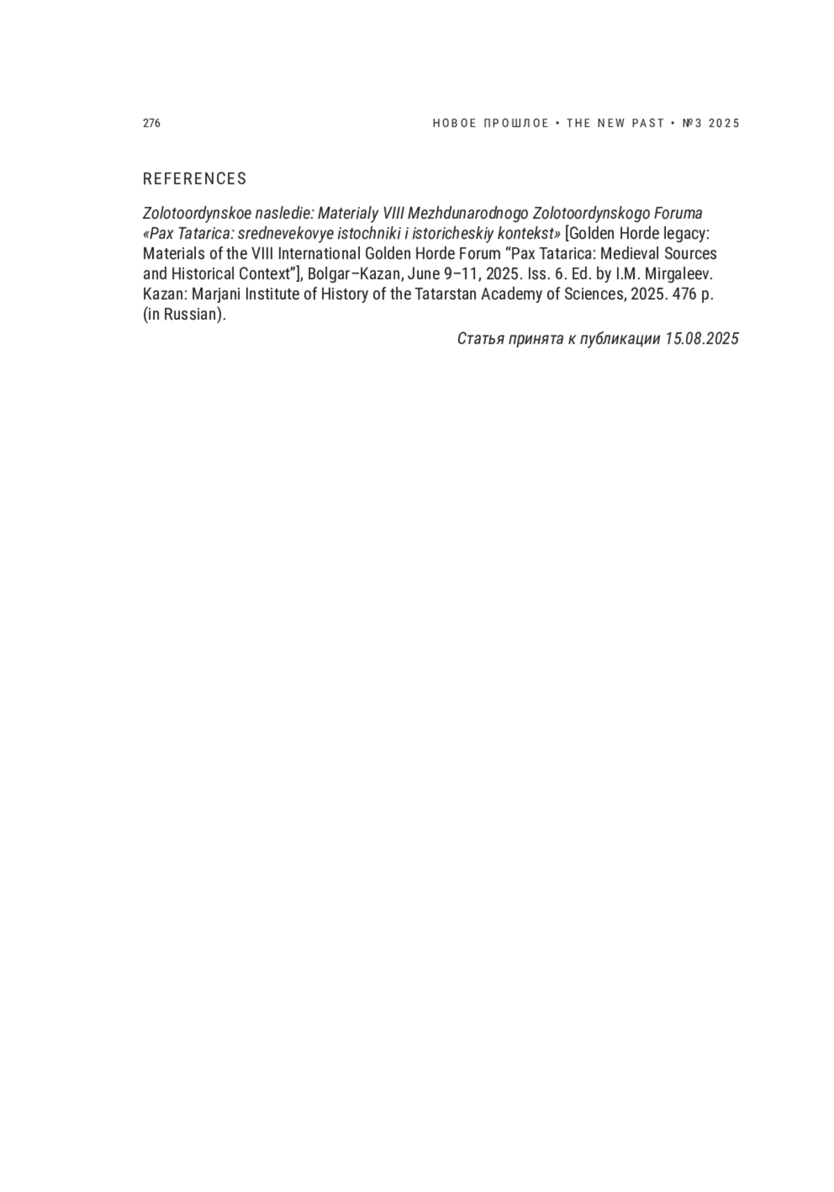 2. Zolotoordynskoe nasledie: Materialy VIIΙ Mezhdunarodnogo Zolotoordynskogo Foruma «Pax Tatarica: srednevekovye istochniki i istoricheskiy kontekst» [Golden Horde legacy: Materials of the VIII International Golden Horde Forum “Pax Tatarica: Medieval Sources and Historical Context”], Bolgar-Kazan, June 9-11, 2025. Iss. 6. Ed. by I.M. Mirgaleev. Kazan: Marjani Institute of History of the Tatarstan Academy of Sciences, 2025. 476 p. (in Russian).