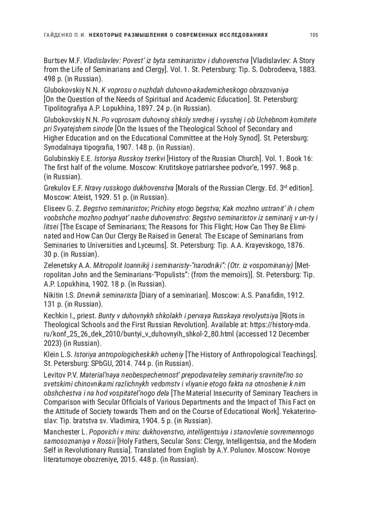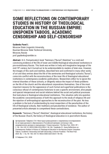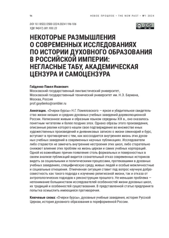 ГАЙДЕНКО П. И. НЕКОТОРЫЕ РАЗМЫШЛЕНИЯ О СОВРЕМЕННЫХ ИССЛЕДОВАНИЯХ ПО ИСТОРИИ ДУХОВНОГО ОБРАЗОВАНИЯ В РОССИЙСКОЙ ИМПЕРИИ: НЕГЛАСНЫЕ ТАБУ, АКАДЕМИЧЕСКАЯ ЦЕНЗУРА И САМОЦЕНЗУРА // НОВОЕ ПРОШЛОЕ. 2024. № 1