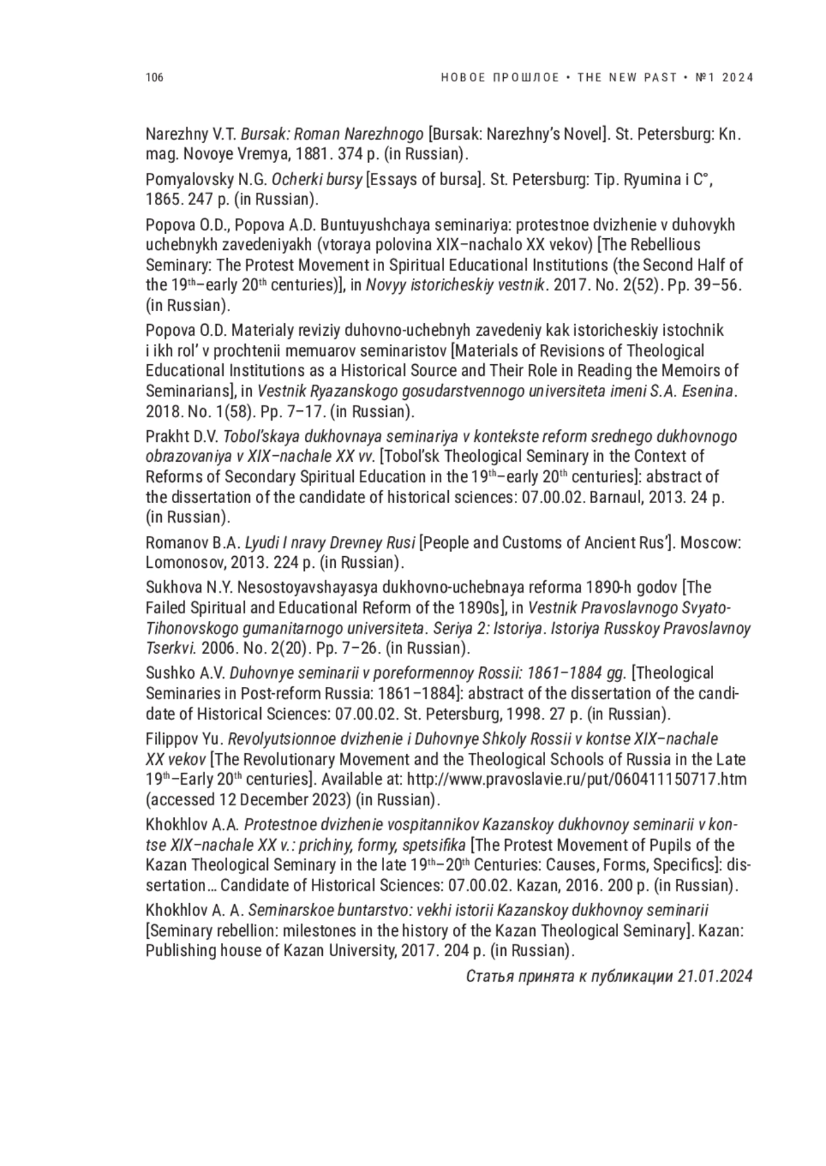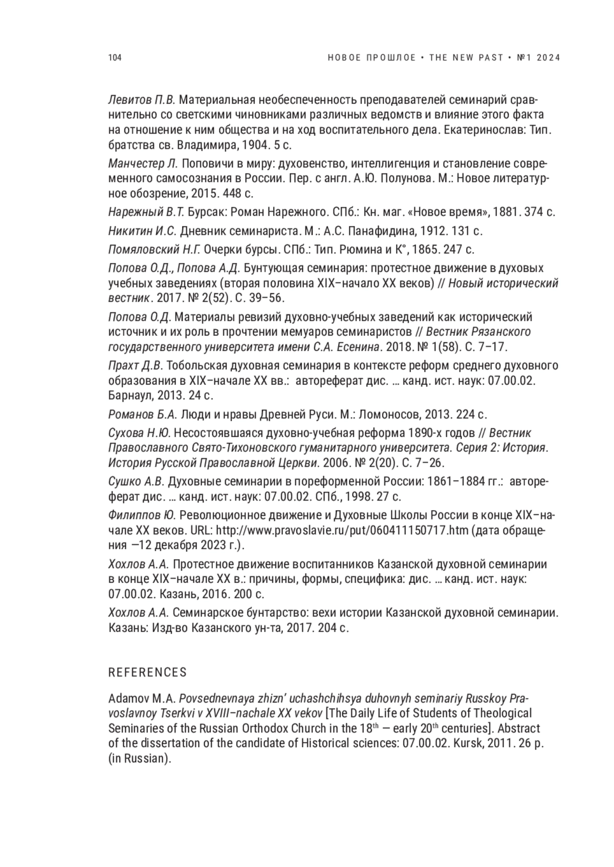 Статья: НЕКОТОРЫЕ РАЗМЫШЛЕНИЯ О СОВРЕМЕННЫХ ИССЛЕДОВАНИЯХ ПО ИСТОРИИ ДУХОВНОГО ОБРАЗОВАНИЯ В РОССИЙСКОЙ ИМПЕРИИ: НЕГЛАСНЫЕ ТАБУ, АКАДЕМИЧЕСКАЯ ЦЕНЗУРА И САМОЦЕНЗУРА (2024)