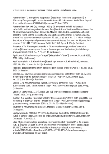 5. Зеленин И.Е. Аграрная политика Н.С. Хрущева и сельское хозяйство страны // Отечественная история. 2000. № 1. C. 76-93. EDN: THLTTJ