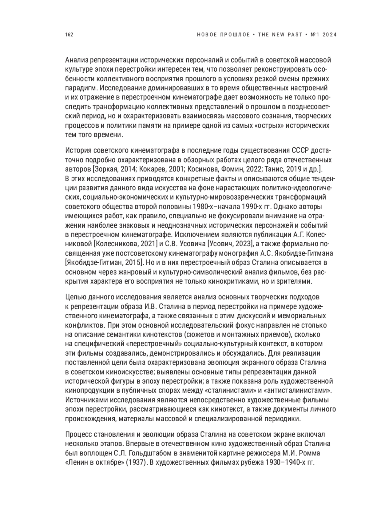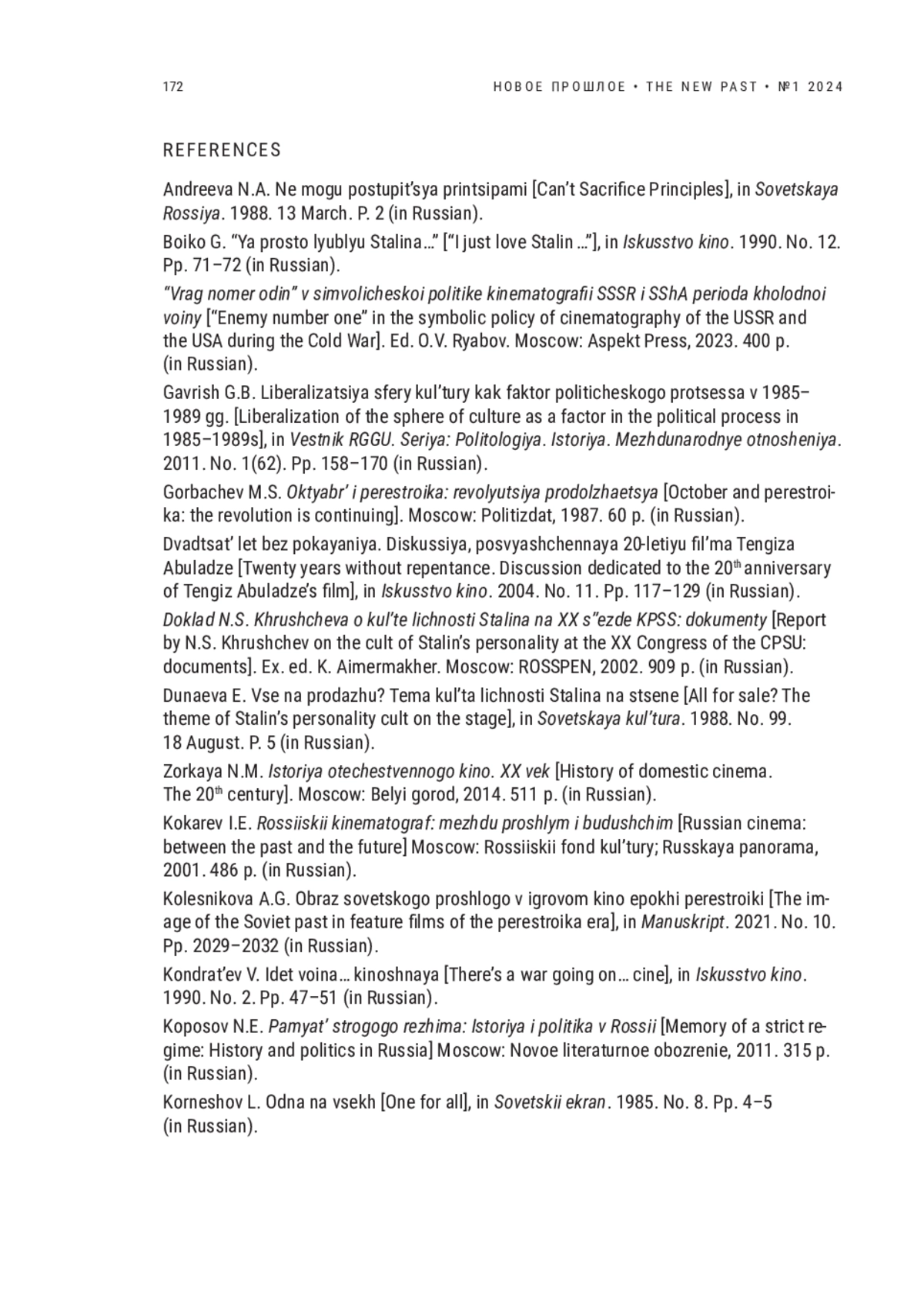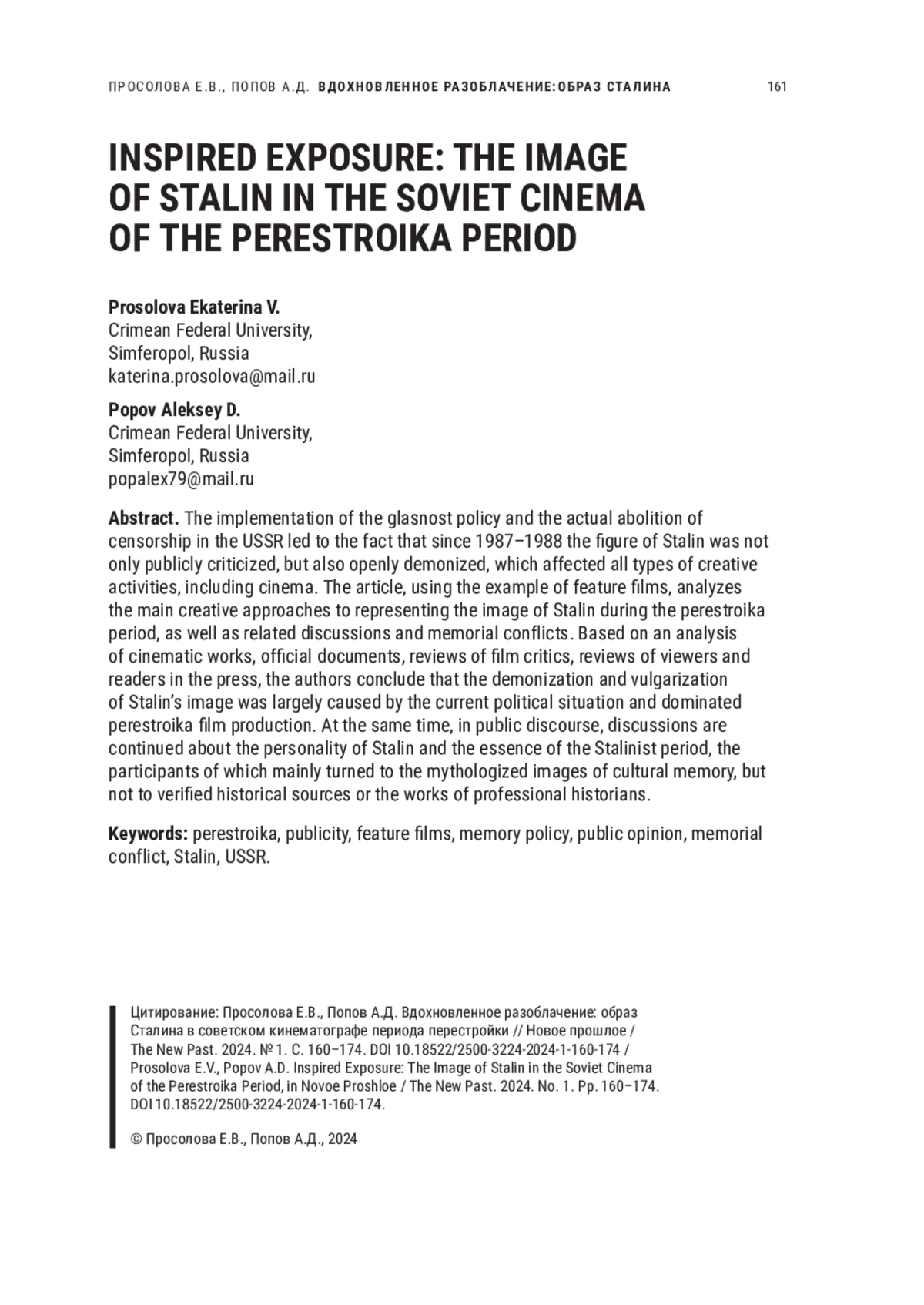 Реализация политики гласности и фактическая отмена цензуры в СССР привели к тому, что начиная с 1987–1988 гг. фигура Сталина не просто подвергалась публичной критике, но и откровенно демонизировалась, что затронуло все виды творческой деятельности, включая и кинематограф. В статье на примере художественного кино анализируются основные творческие подходы к репрезентации образа И. В. Сталина в период перестройки, а также связанные с ними дискуссии и мемориальные конфликты. На основе анализа кинематографических произведений, официальных документов, рецензий кинокритиков, отзывов зрителей и читателей в прессе авторы приходят к выводу о том, что демонизация и вульгаризация образа Сталина доминировали в перестроечной кинопродукции и во многом были вызваны текущей политической конъюнктурой. В то же время, в публичном дискурсе продолжались дискуссии о личности Сталине и сущности сталинского периода, участники которых обращались в основном к мифологизированным образам культурной памяти, а не к верифицированным историческим источникам или трудам профессиональных историков