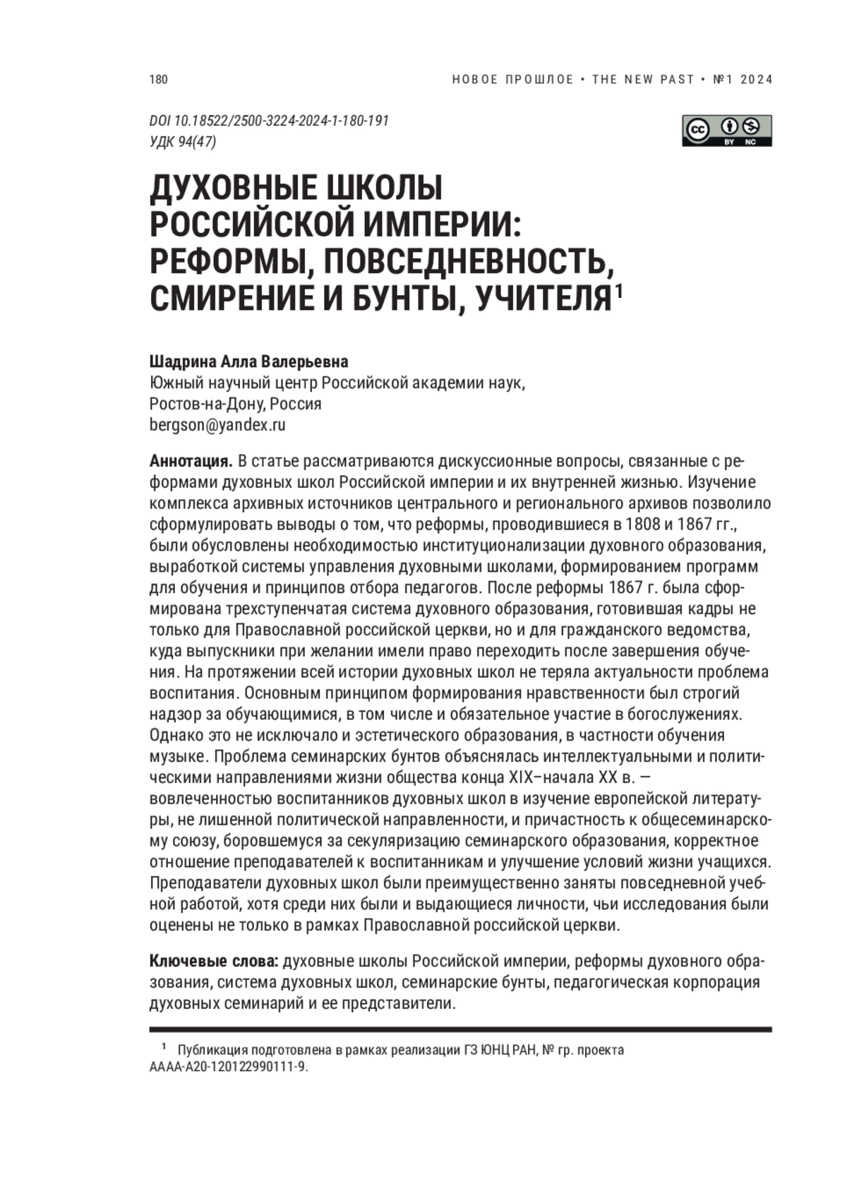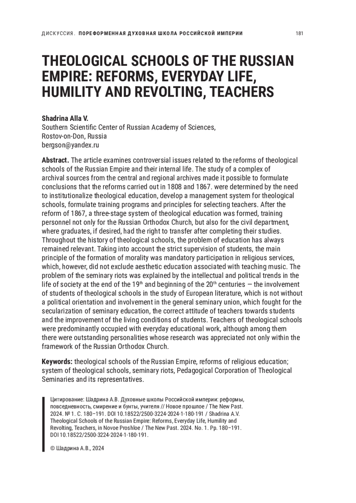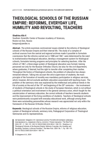 В статье рассматриваются дискуссионные вопросы, связанные с реформами духовных школ Российской империи и их внутренней жизнью. Изучение комплекса архивных источников центрального и регионального архивов позволило сформулировать выводы о том, что реформы, проводившиеся в 1808 и 1867Ǿгг., были обусловлены необходимостью институционализации духовного образования, выработкой системы управления духовными школами, формированием программ для обучения и принципов отбора педагогов. После реформы 1867Ǿг. была сформирована трехступенчатая система духовного образования, готовившая кадры не только для Православной российской церкви, но и для гражданского ведомства, куда выпускники при желании имели право переходить после завершения обучения. На протяжении всей истории духовных школ не теряла актуальности проблема воспитания. Основным принципом формирования нравственности был строгий надзор за обучающимися, в том числе и обязательное участие в богослужениях. Однако это не исключало и эстетического образования, в частности обучения музыке. Проблема семинарских бунтов объяснялась интеллектуальными и политическими направлениями жизни общества конца XIX–начала XXǾв. — вовлеченностью воспитанников духовных школ в изучение европейской литературы, не лишенной политической направленности, и причастность к общесеминарскому союзу, боровшемуся за секуляризацию семинарского образования, корректное отношение преподавателей к воспитанникам и улучшение условий жизни учащихся. Преподаватели духовных школ были преимущественно заняты повседневной учебной работой, хотя среди них были и выдающиеся личности, чьи исследования были оценены не только в рамках Православной российской церкви