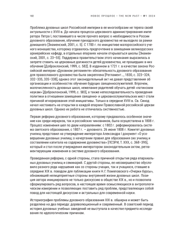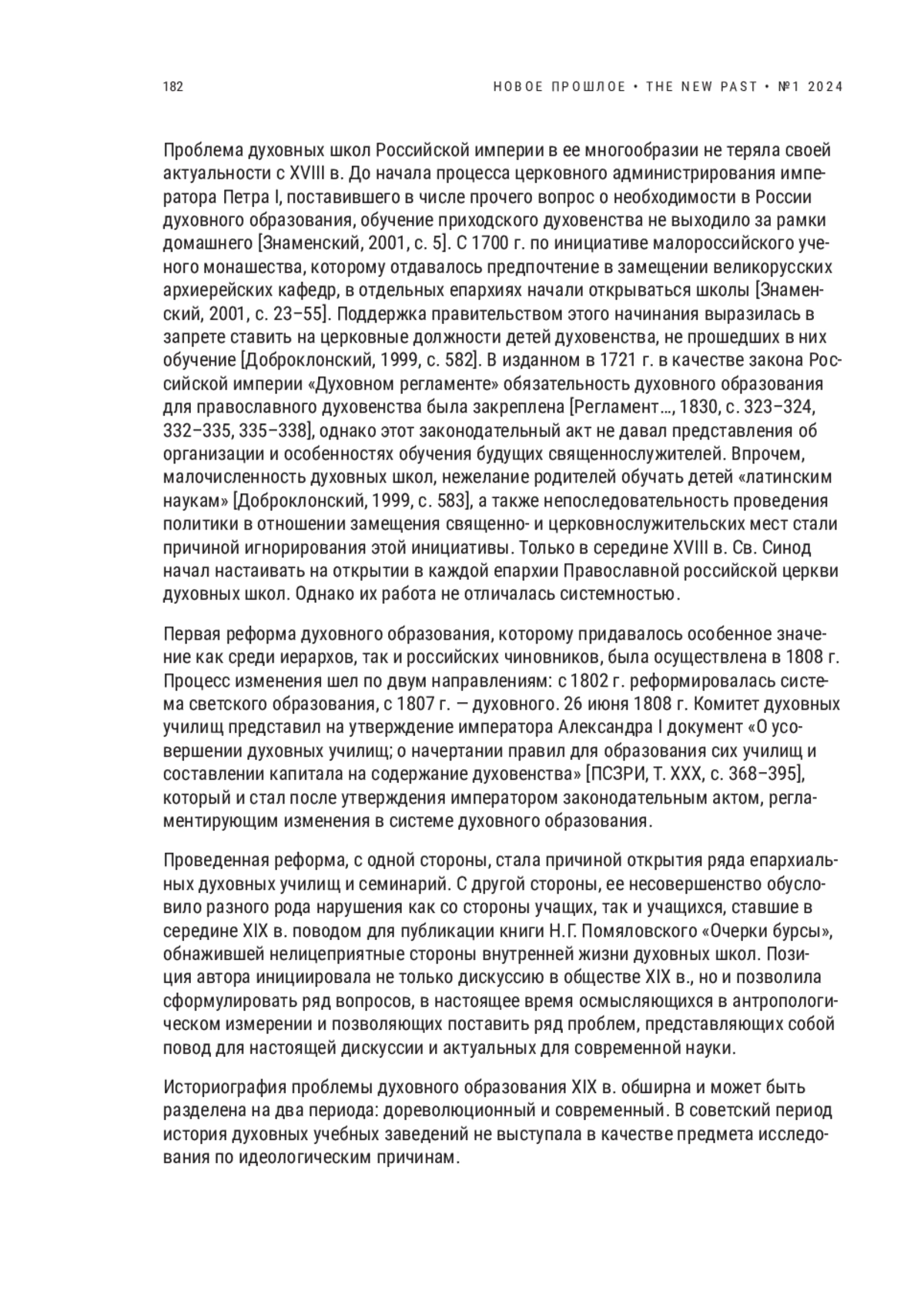 Проблема духовных школ Российской империи в ее многообразии не теряла своей актуальности с XVIII в. До начала процесса церковного администрирования императора Петра I, поставившего в числе прочего вопрос о необходимости в России духовного образования, обучение приходского духовенства не выходило за рамки домашнего [Знаменский, 2001, с. 5]. С 1700 г. по инициативе малороссийского ученого монашества, которому отдавалось предпочтение в замещении великорусских архиерейских кафедр, в отдельных епархиях начали открываться школы [Знаменский, 2001, с. 23–55]. Поддержка правительством этого начинания выразилась в запрете ставить на церковные должности детей духовенства, не прошедших в них обучение [Доброклонский, 1999, с. 582].