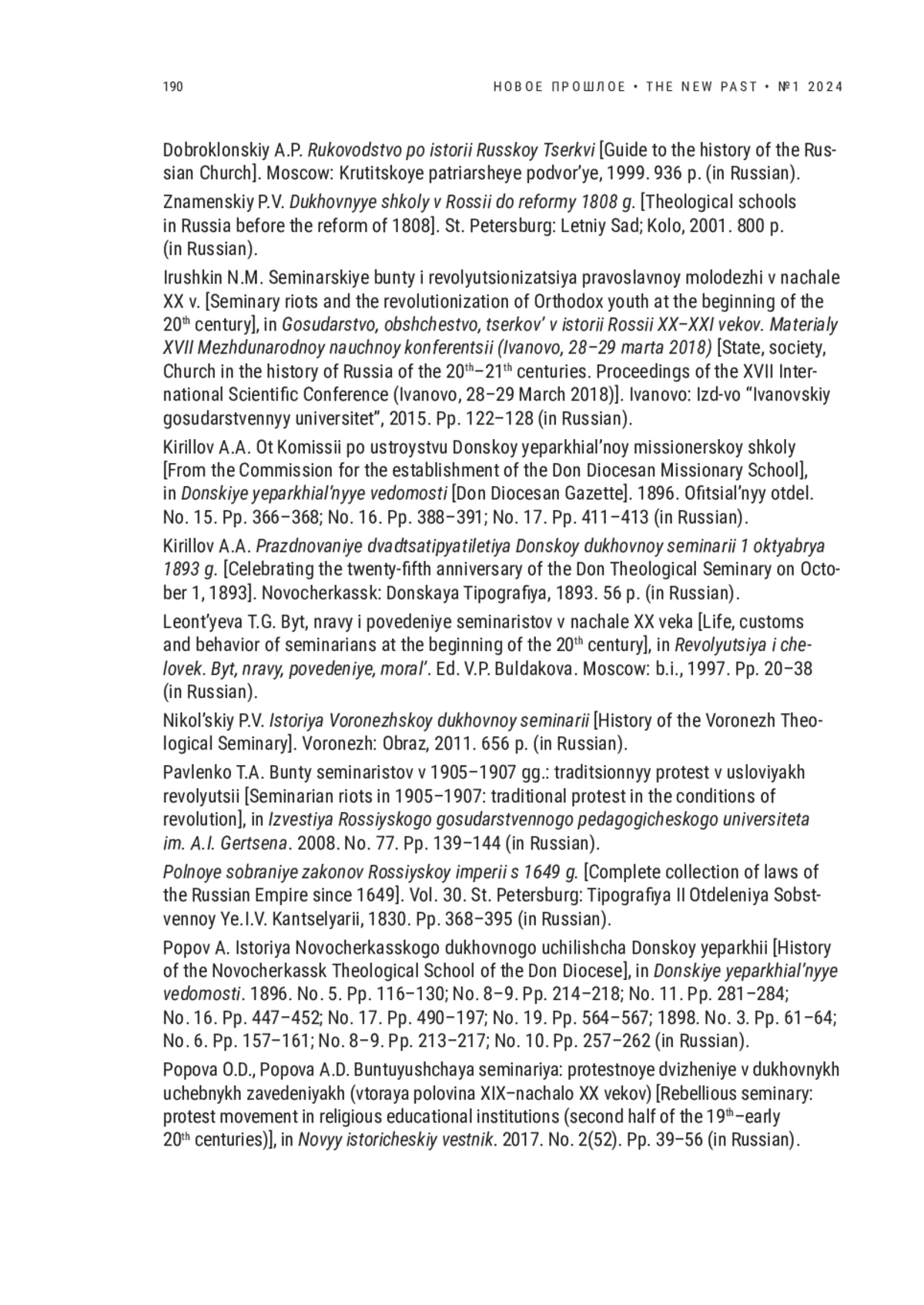 19. Попова О.Д., Попова А.Д. Бунтующая семинария: протестное движение в духовных учебных заведениях (вторая половина XIX - начало XX веков) // Новый исторический вестник. 2017. № 2 (52). С. 39-56. EDN: ZPDYTD