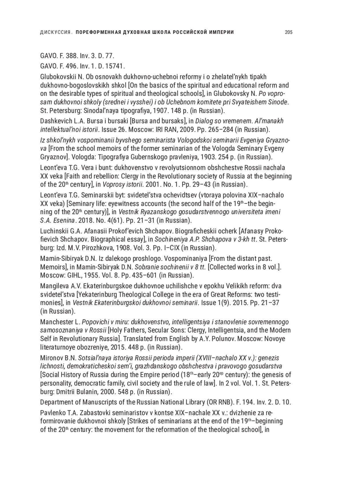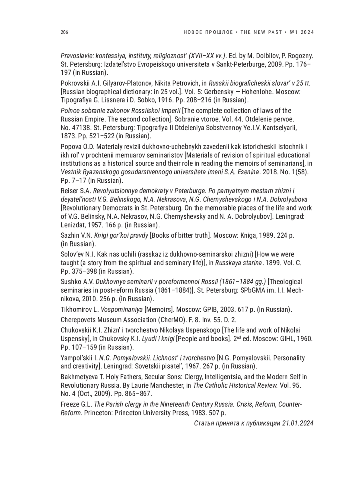 32. Bakhmetyeva T. Holy Fathers, Secular Sons: Clergy, Intelligentsia, and the Modern Self in Revolutionary Russia by Laurie Manchester // The Catholic Historical Review. Vol. 95, No. 4 (Oct., 2009). Pp. 865-867.