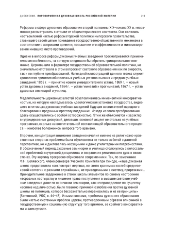 В статье рассматриваются дискуссионные вопросы, связанные с реформами духовных школ Российской империи и их внутренней жизнью. Изучение комплекса архивных источников центрального и регионального архивов позволило сформулировать выводы о том, что реформы, проводившиеся в 1808 и 1867Ǿгг., были обусловлены необходимостью институционализации духовного образования, выработкой системы управления духовными школами, формированием программ для обучения и принципов отбора педагогов. После реформы 1867Ǿг. была сформирована трехступенчатая система духовного образования, готовившая кадры не только для Православной российской церкви, но и для гражданского ведомства, куда выпускники при желании имели право переходить после завершения обучения. На протяжении всей истории духовных школ не теряла актуальности проблема воспитания. Основным принципом формирования нравственности был строгий надзор за обучающимися, в том числе и обязательное участие в богослужениях. Однако это не исключало и эстетического образования, в частности обучения музыке. Проблема семинарских бунтов объяснялась интеллектуальными и политическими направлениями жизни общества конца XIX–начала XXǾв. — вовлеченностью воспитанников духовных школ в изучение европейской литературы, не лишенной политической направленности, и причастность к общесеминарскому союзу, боровшемуся за секуляризацию семинарского образования, корректное отношение преподавателей к воспитанникам и улучшение условий жизни учащихся. Преподаватели духовных школ были преимущественно заняты повседневной учебной работой, хотя среди них были и выдающиеся личности, чьи исследования были оценены не только в рамках Православной российской церкви