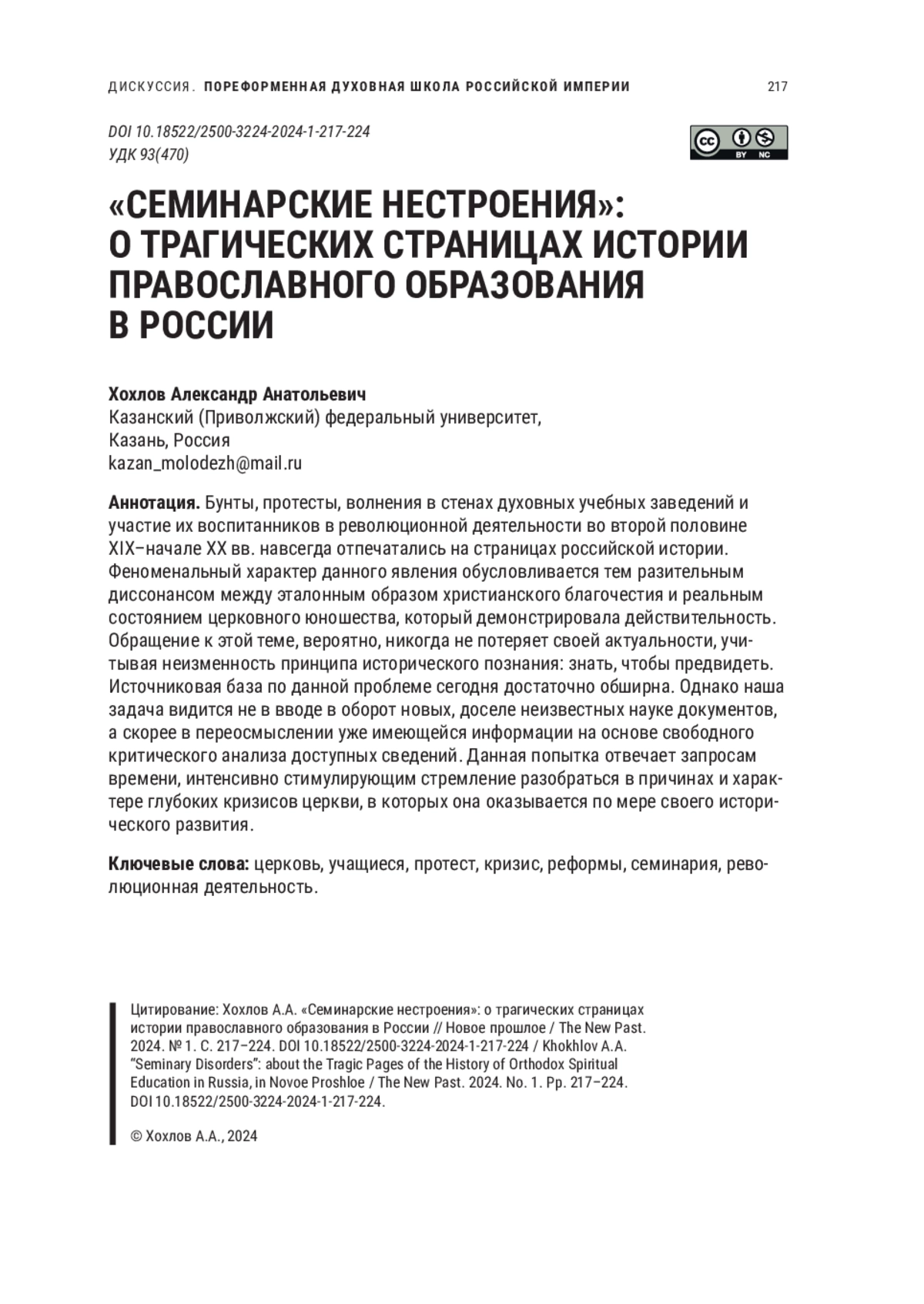 Бунты, протесты, волнения в стенах духовных учебных заведений и участие их воспитанников в революционной деятельности во второй половине XIX–начале XX вв. навсегда отпечатались на страницах российской истории. Феноменальный характер данного явления обусловливается тем разительным диссонансом между эталонным образом христианского благочестия и реальным состоянием церковного юношества, который демонстрировала действительность. Обращение к этой теме, вероятно, никогда не потеряет своей актуальности, учитывая неизменность принципа исторического познания: знать, чтобы предвидеть. Источниковая база по данной проблеме сегодня достаточно обширна. Однако наша задача видится не в вводе в оборот новых, доселе неизвестных науке документов, а скорее в переосмыслении уже имеющейся информации на основе свободного критического анализа доступных сведений. Данная попытка отвечает запросам времени, интенсивно стимулирующим стремление разобраться в причинах и характере глубоких кризисов церкви, в которых она оказывается по мере своего исторического развития