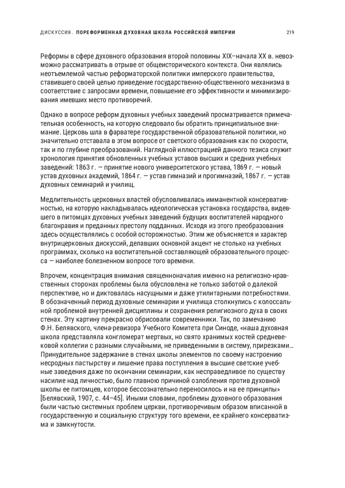 1. Белявский Ф.Н. О реформе духовной школы. Часть 1: Краткий очерк прошлого средней духовной школы. СПб.: Синодальная типография, 1907. 230 с.