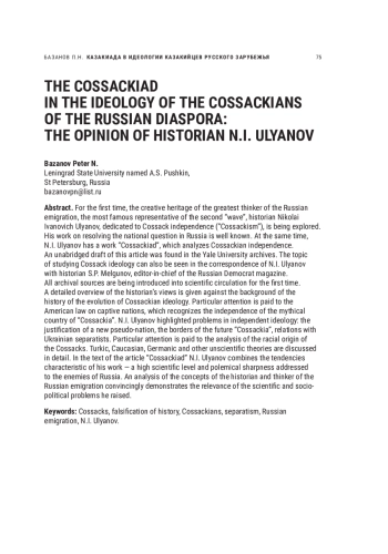 В статье рассматривается творческое наследие крупнейшего мыслителя русской эмиграции, наиболее известного представителя второй «волны» — историка Николая Ивановича Ульянова, посвященное казачьему самостийничеству («казакийству»). Хорошо известны его работы по разрешению национального вопроса в России. В то же время у Н. И. Ульянова есть работа «Казакиада», анализирующая казакийскую самостийность. В архиве «Лондонской школы экономики и политических наук» удалось найти несокращенный черновик данной статьи. Тема изучения казакийской идеологии прослеживается также в переписке Н. И. Ульянова с историком С. П. Мельгуновым, главным редактором журнала «Российский демократ». Все архивные источники впервые вводятся в научный оборот. Представлен подробный обзор взглядов историка на фоне истории эволюции казакийской идеологии. Особенное внимание уделяется американскому закону о порабощенных нациях, по которому признается независимость мифической страны «Казакия». Н. И. Ульянов выделял проблемы в самостийнической идеологии: обоснование новой псевдонации, границы будущей «Казакии», взаимоотношения с украинскими сепаратистами. Особенное внимание уделяется анализу расового происхождения казачества. Подробно рассматривается тюркская, кавказская, германская и другие ненаучные теории. В тексте статьи Н. И. Ульянова «Казакиада» сочетаются тенденции, характерные для его творчества — высокий научный уровень и полемическая заостренность, обращенная к врагам России. Анализ концепций историка и мыслителя русской эмиграции убедительно свидетельствует об актуальности поднятых им научных и общественно-политических проблем