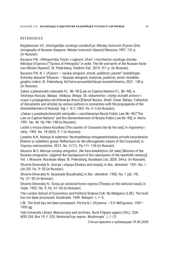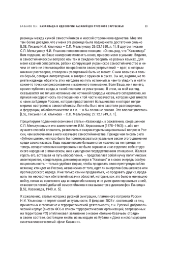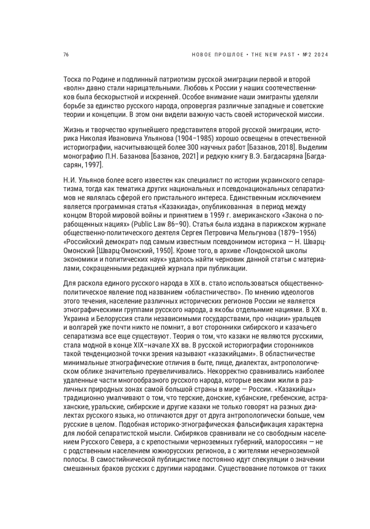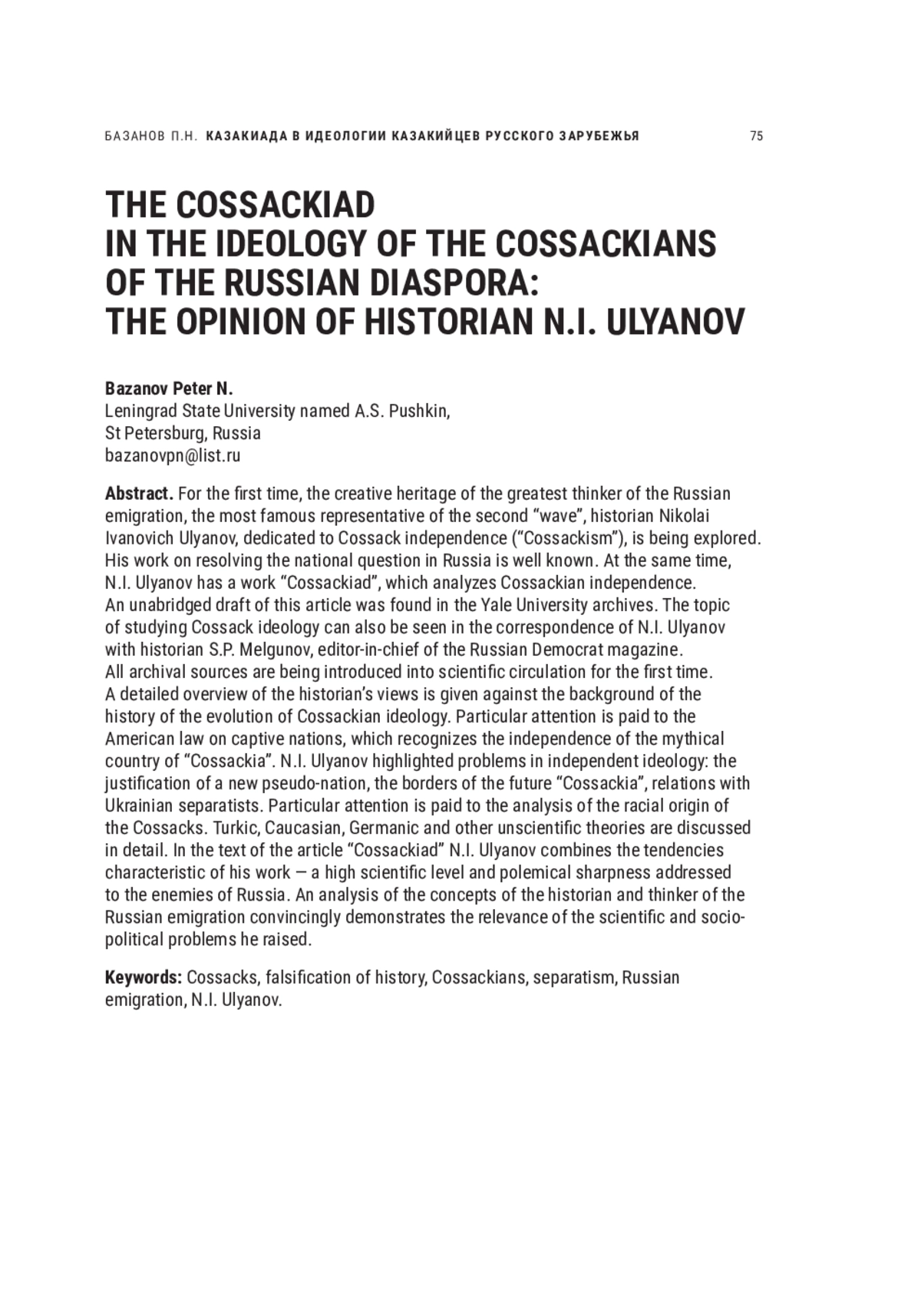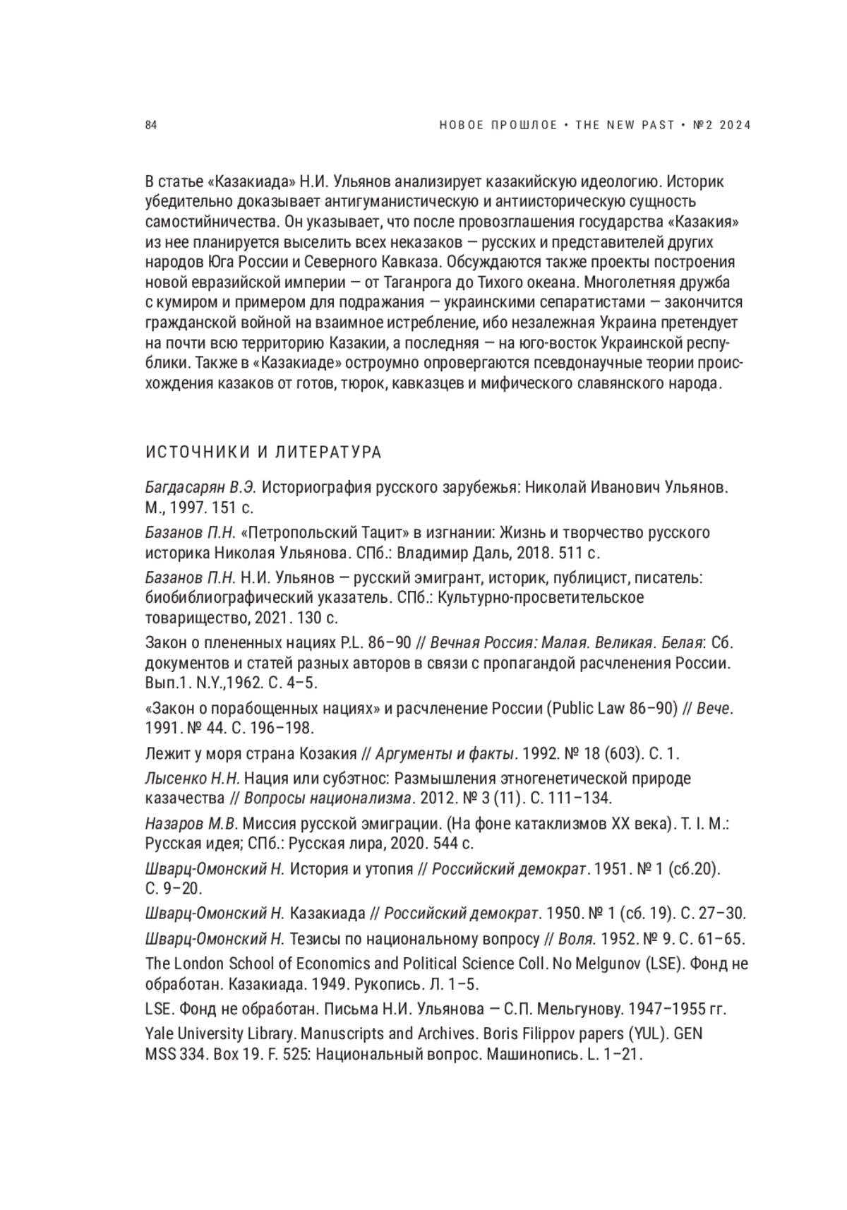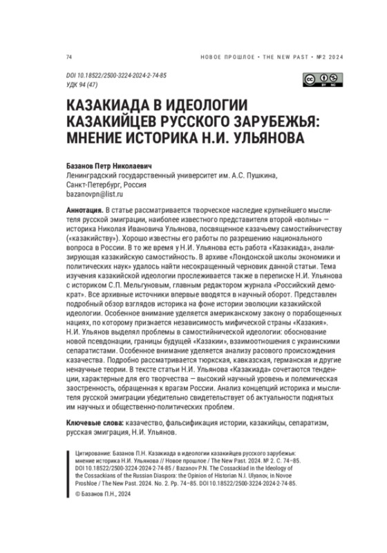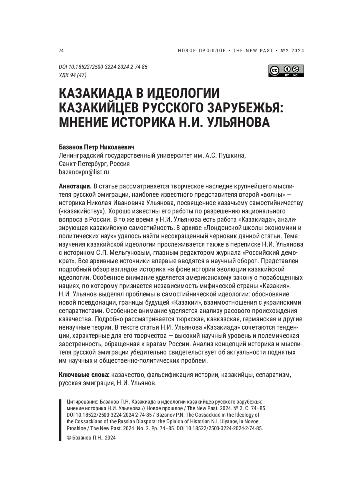 БАЗАНОВ П. Н. КАЗАКИАДА В ИДЕОЛОГИИ КАЗАКИЙЦЕВ РУССКОГО ЗАРУБЕЖЬЯ: МНЕНИЕ ИСТОРИКА Н. И. УЛЬЯНОВА // НОВОЕ ПРОШЛОЕ. 2024. № 2