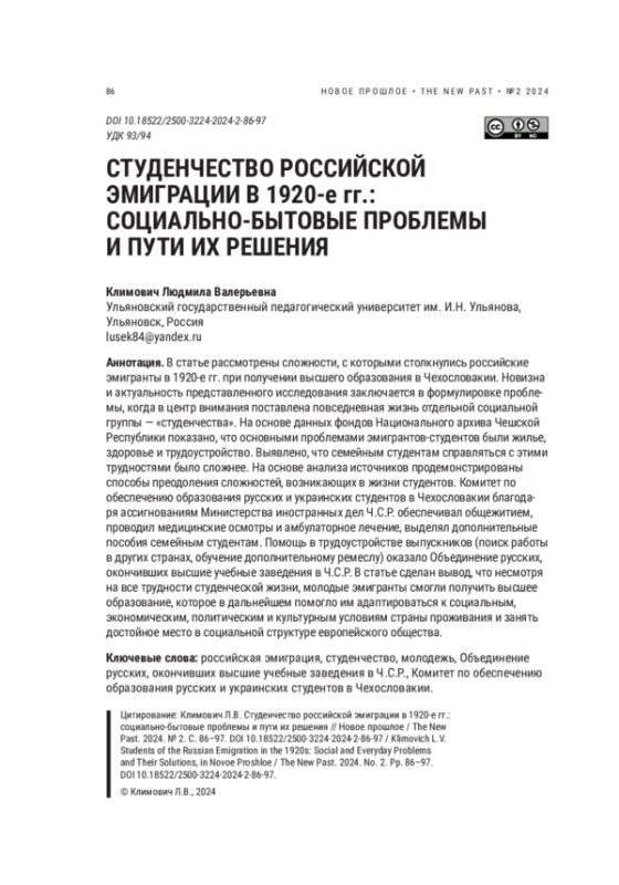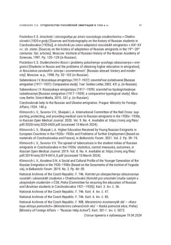 14. Klimovich L.V., Shaipak L.A. Higher Education Received by Young Russian Emigrants in European Countries in the 1920s-1930s and Problems of further Employment (Based on materials of Czechoslovakia and France) // Balkanistic Forum. 2021. Vol. 2. P. 59-74. EDN: PRPOPD
