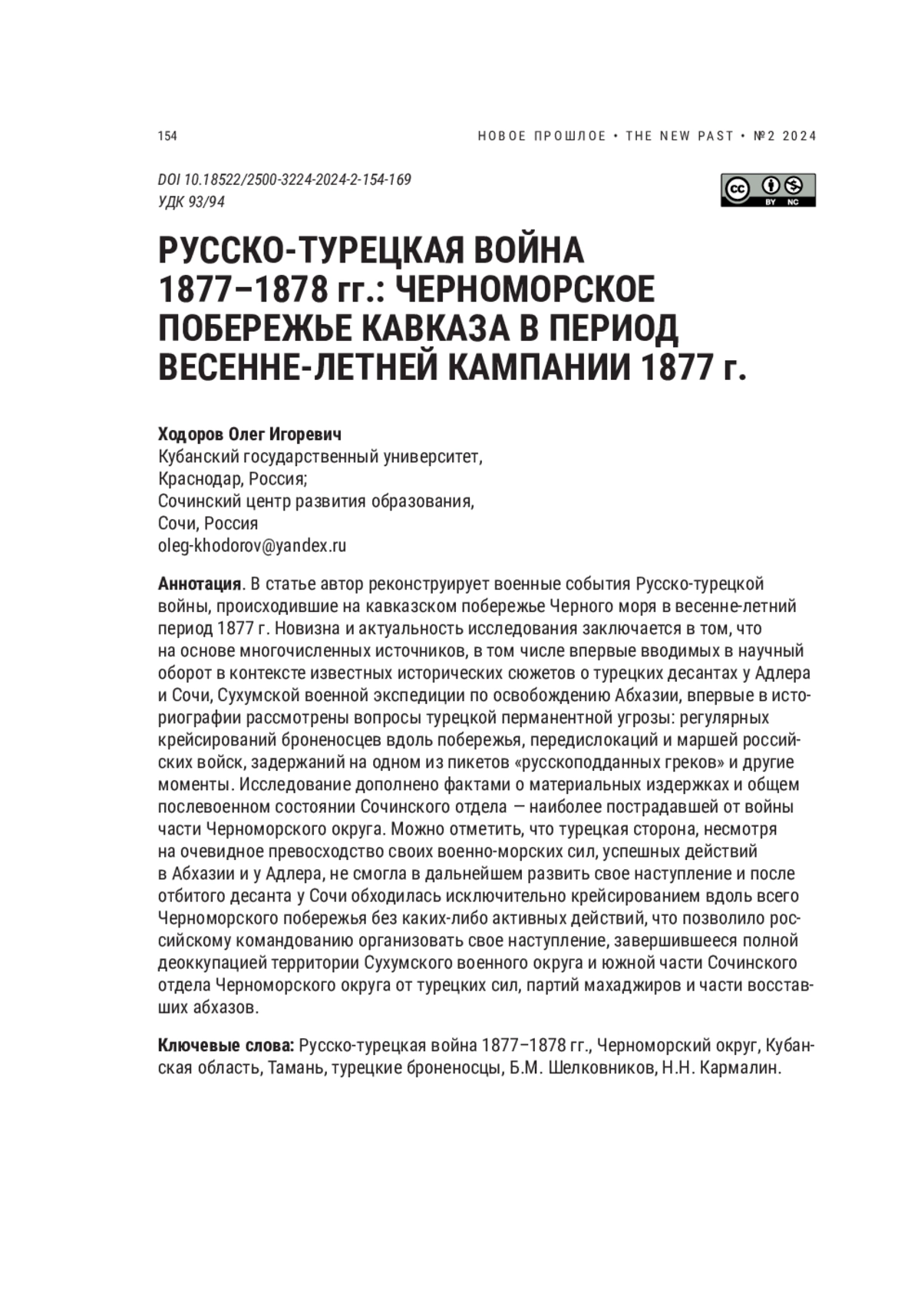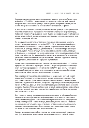 В статье автор реконструирует военные события Русско-турецкой войны, происходившие на кавказском побережье Черного моря в весенне-летний период 1877 г. Новизна и актуальность исследования заключается в том, что на основе многочисленных источников, в том числе впервые вводимых в научный оборот в контексте известных исторических сюжетов о турецких десантах у Адлера и Сочи, Сухумской военной экспедиции по освобождению Абхазии, впервые в историографии рассмотрены вопросы турецкой перманентной угрозы: регулярных крейсирований броненосцев вдоль побережья, передислокаций и маршей российских войск, задержаний на одном из пикетов «русскоподданных греков» и другие моменты. Исследование дополнено фактами о материальных издержках и общем послевоенном состоянии Сочинского отдела — наиболее пострадавшей от войны части Черноморского округа. Можно отметить, что турецкая сторона, несмотря на очевидное превосходство своих военно-морских сил, успешных действий в Абхазии и у Адлера, не смогла в дальнейшем развить свое наступление и после отбитого десанта у Сочи обходилась исключительно крейсированием вдоль всего Черноморского побережья без каких-либо активных действий, что позволило российскому командованию организовать свое наступление, завершившееся полной деоккупацией территории Сухумского военного округа и южной части Сочинского отдела Черноморского округа от турецких сил, партий махаджиров и части восставших абхазов
