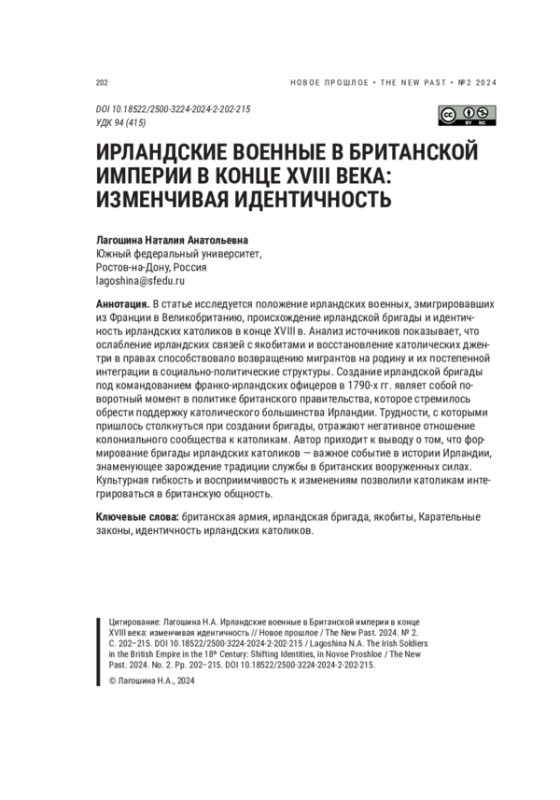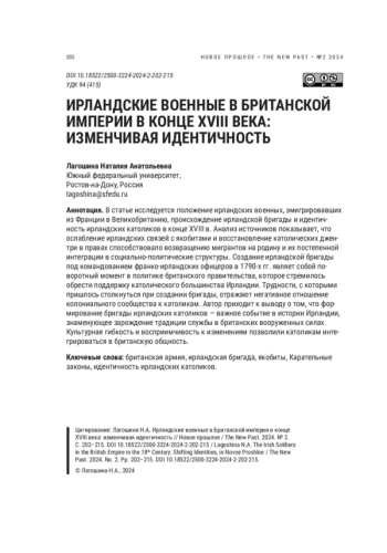 В статье исследуется положение ирландских военных, эмигрировавших из Франции в Великобританию, происхождение ирландской бригады и идентичность ирландских католиков в конце XVIII в. Анализ источников показывает, что ослабление ирландских связей с якобитами и восстановление католических джентри в правах способствовало возвращению мигрантов на родину и их постепенной интеграции в социально-политические структуры. Создание ирландской бригады под командованием франко-ирландских офицеров в 1790-х гг. являет собой поворотный момент в политике британского правительства, которое стремилось обрести поддержку католического большинства Ирландии. Трудности, с которыми пришлось столкнуться при создании бригады, отражают негативное отношение колониального сообщества к католикам. Автор приходит к выводу о том, что формирование бригады ирландских католиков — важное событие в истории Ирландии, знаменующее зарождение традиции службы в британских вооруженных силах. Культурная гибкость и восприимчивость к изменениям позволили католикам интегрироваться в британскую общность