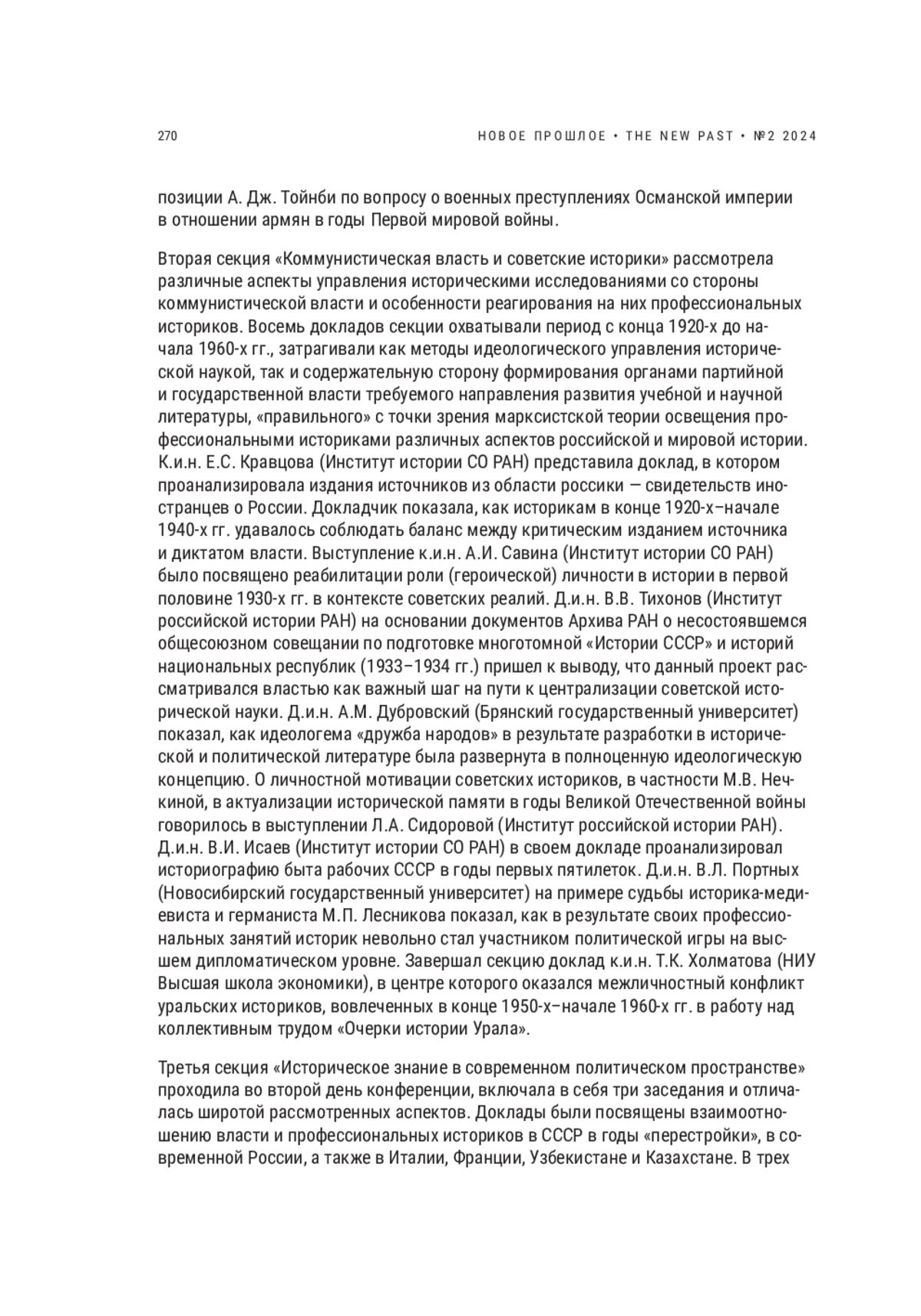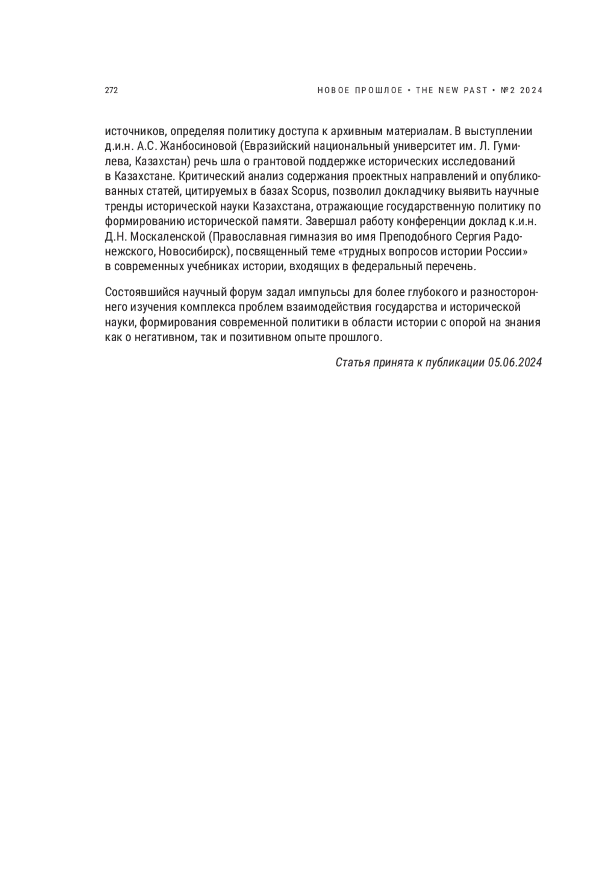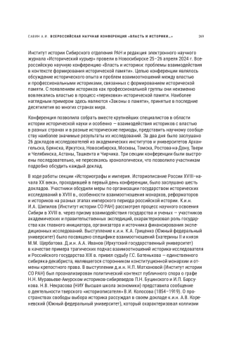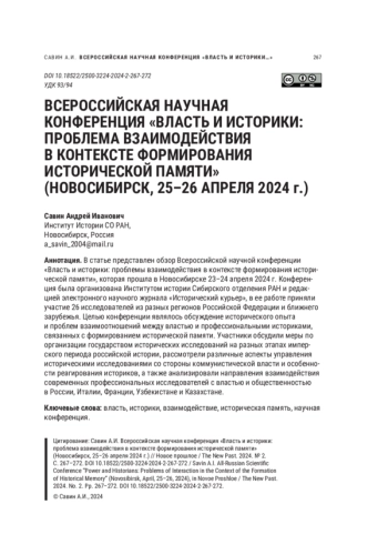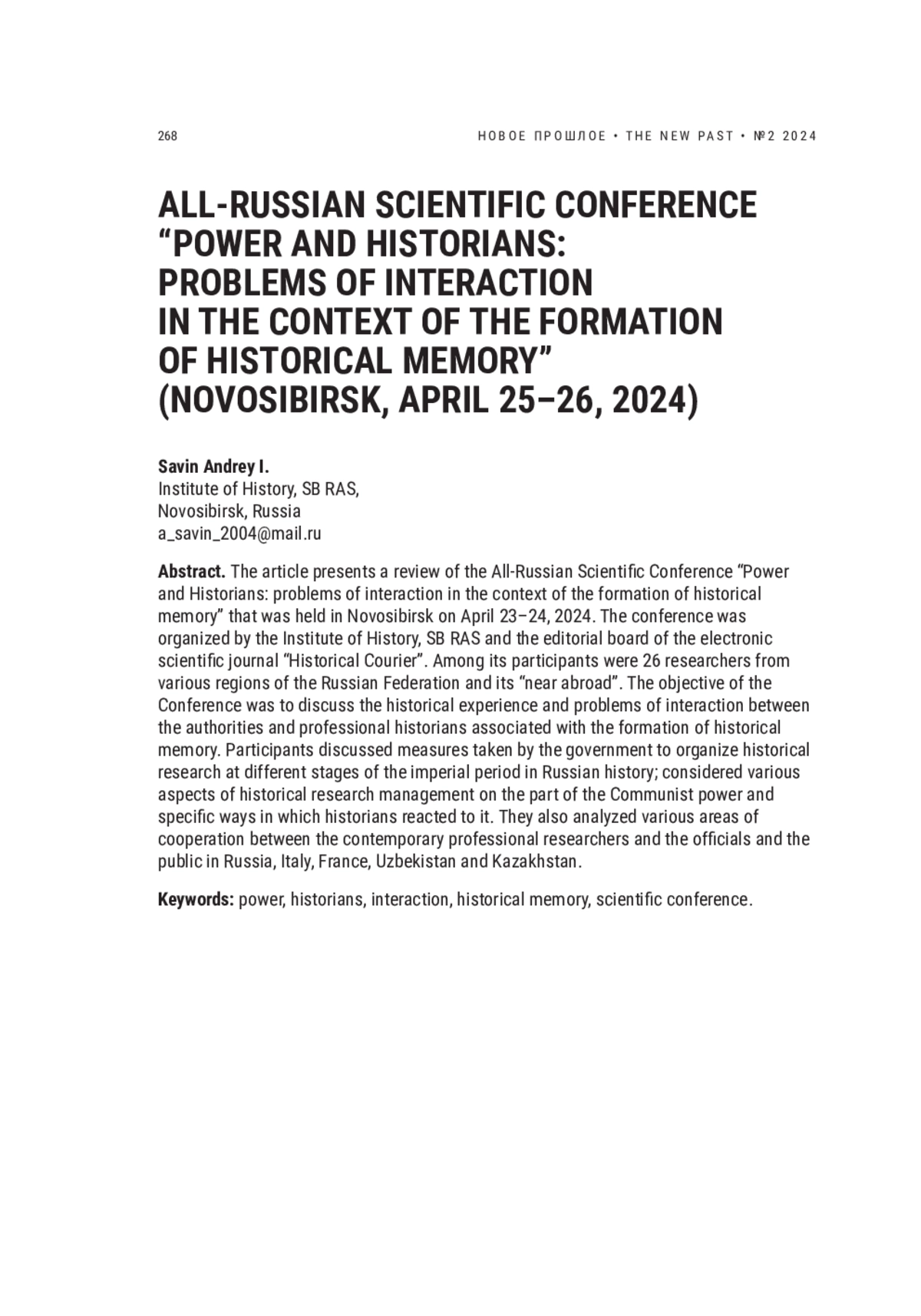 САВИН А. И. ВСЕРОССИЙСКАЯ НАУЧНАЯ КОНФЕРЕНЦИЯ "ВЛАСТЬ И ИСТОРИКИ: ПРОБЛЕМА ВЗАИМОДЕЙСТВИЯ В КОНТЕКСТЕ ФОРМИРОВАНИЯ ИСТОРИЧЕСКОЙ ПАМЯТИ" (НОВОСИБИРСК, 25-26 АПРЕЛЯ 2024 Г.) // НОВОЕ ПРОШЛОЕ. 2024. № 2