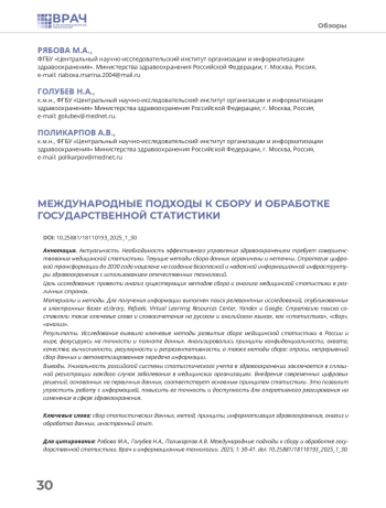 Результаты. Исследование выявило ключевые методы развития сбора медицинской статистики в России и мире, фокусируясь на точности и полноте данных. Анализировались принципы конфиденциальности, охвата, качества, вычислимости, регулярности и репрезентативности, а также методы сбора: опросы, непрерывный сбор данных и автоматизированная передача информации.
