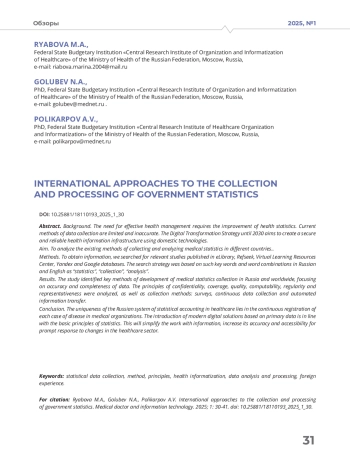 Выводы. Уникальность российской системы статистического учета в здравоохранении заключается в сплошной регистрации каждого случая заболевания в медицинских организациях. Внедрение современных цифровых решений, основанных на первичных данных, соответствует основным принципам статистики. Это позволит упростить работу с информацией, повысить ее точность и доступность для оперативного реагирования на изменения в сфере здравоохранения.