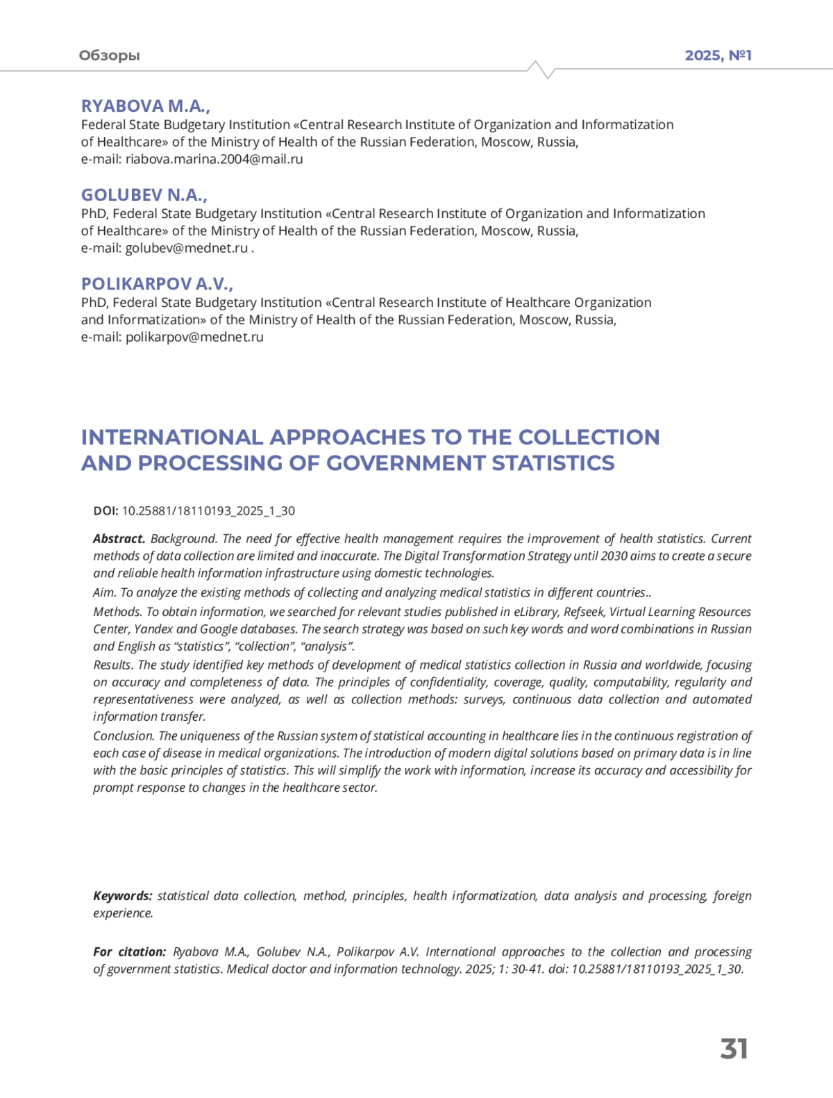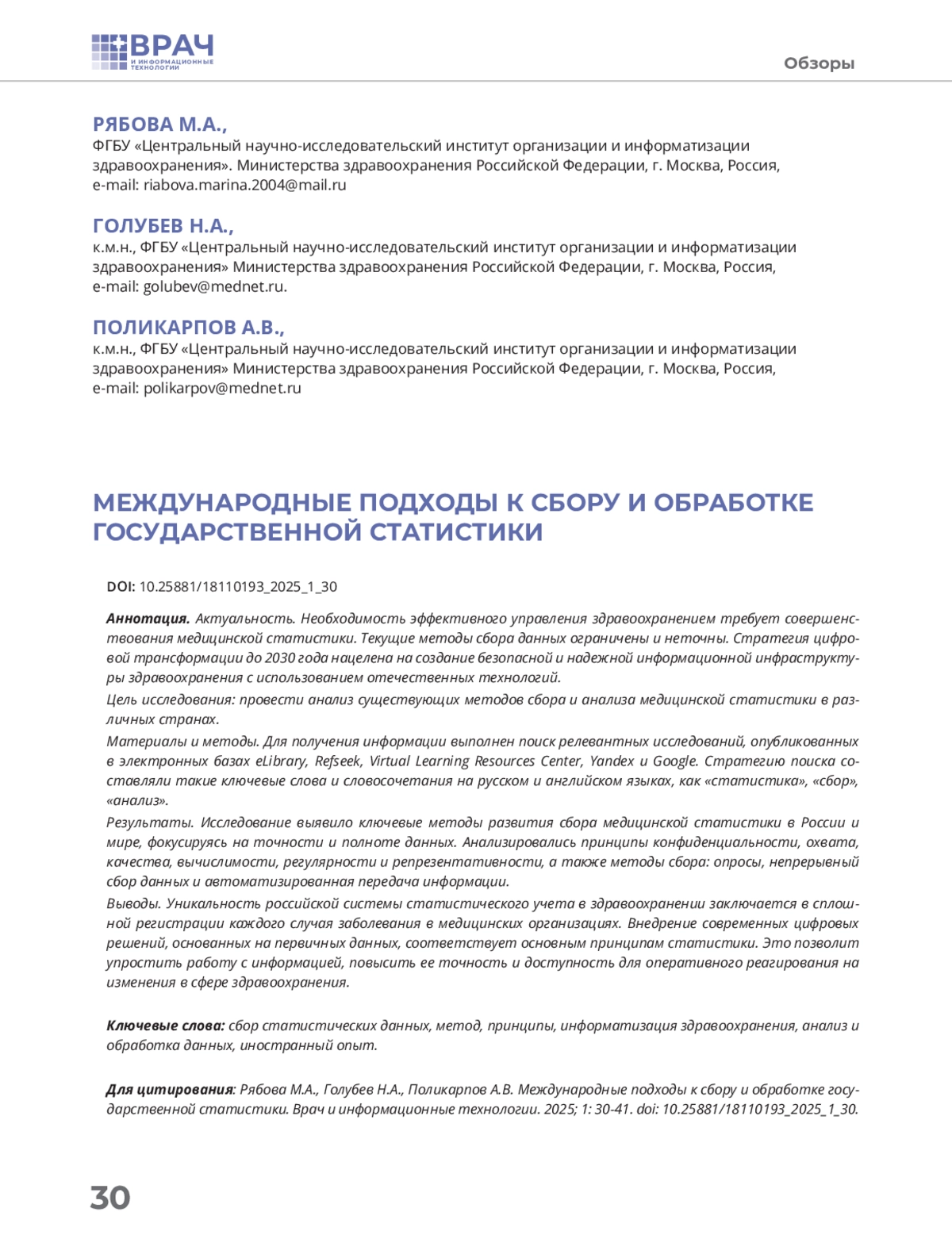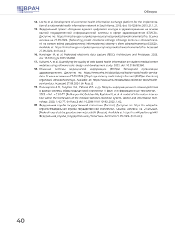 19. Поликарпов А.В., Голубев Н.А., Рябков И.В. и др. Модель информационного взаимодействия в рамках системы сбора медицинской статистики // Врач и информационные технологии. - 2023. - №1. - С.62-77.