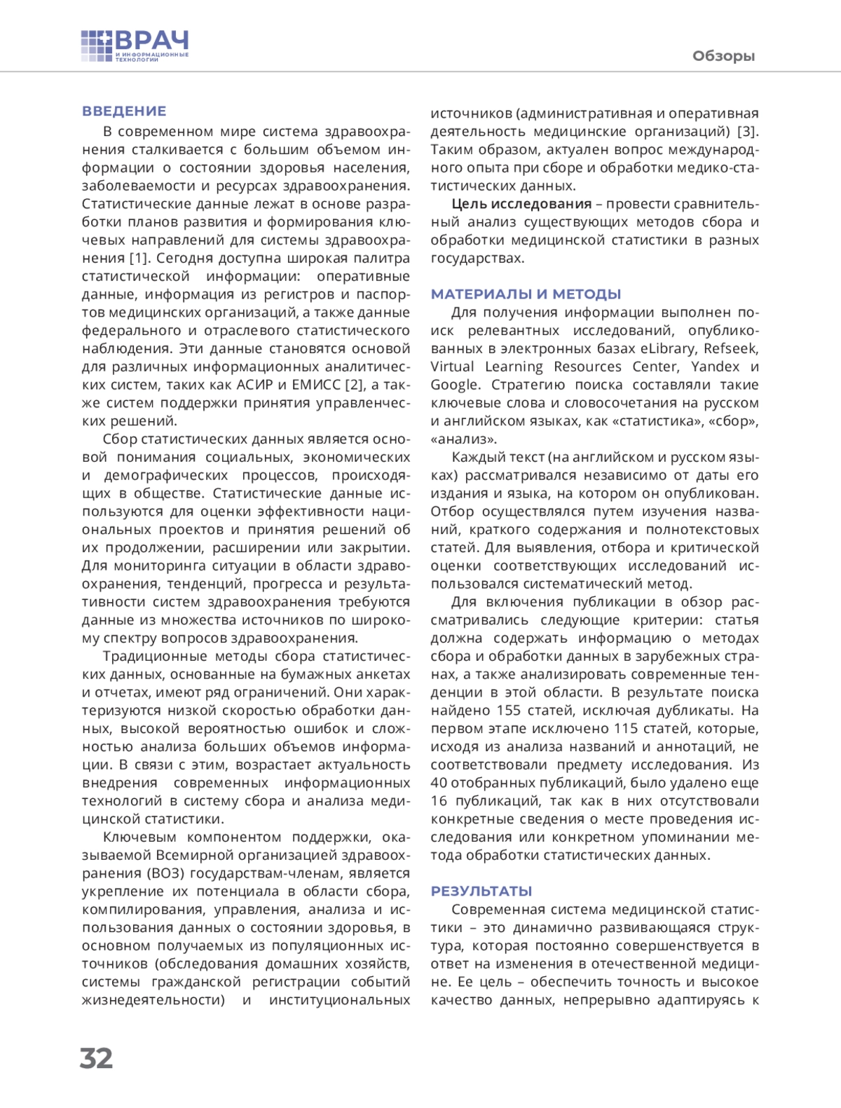 Материалы и методы. Для получения информации выполнен поиск релевантных исследований, опубликованных в электронных базах eLibrary, Refseek, Virtual Learning Resources Center, Yandex и Googlе. Стратегию поиска составляли такие ключевые слова и словосочетания на русском и английском языках, как «статистика», «сбор», «анализ».