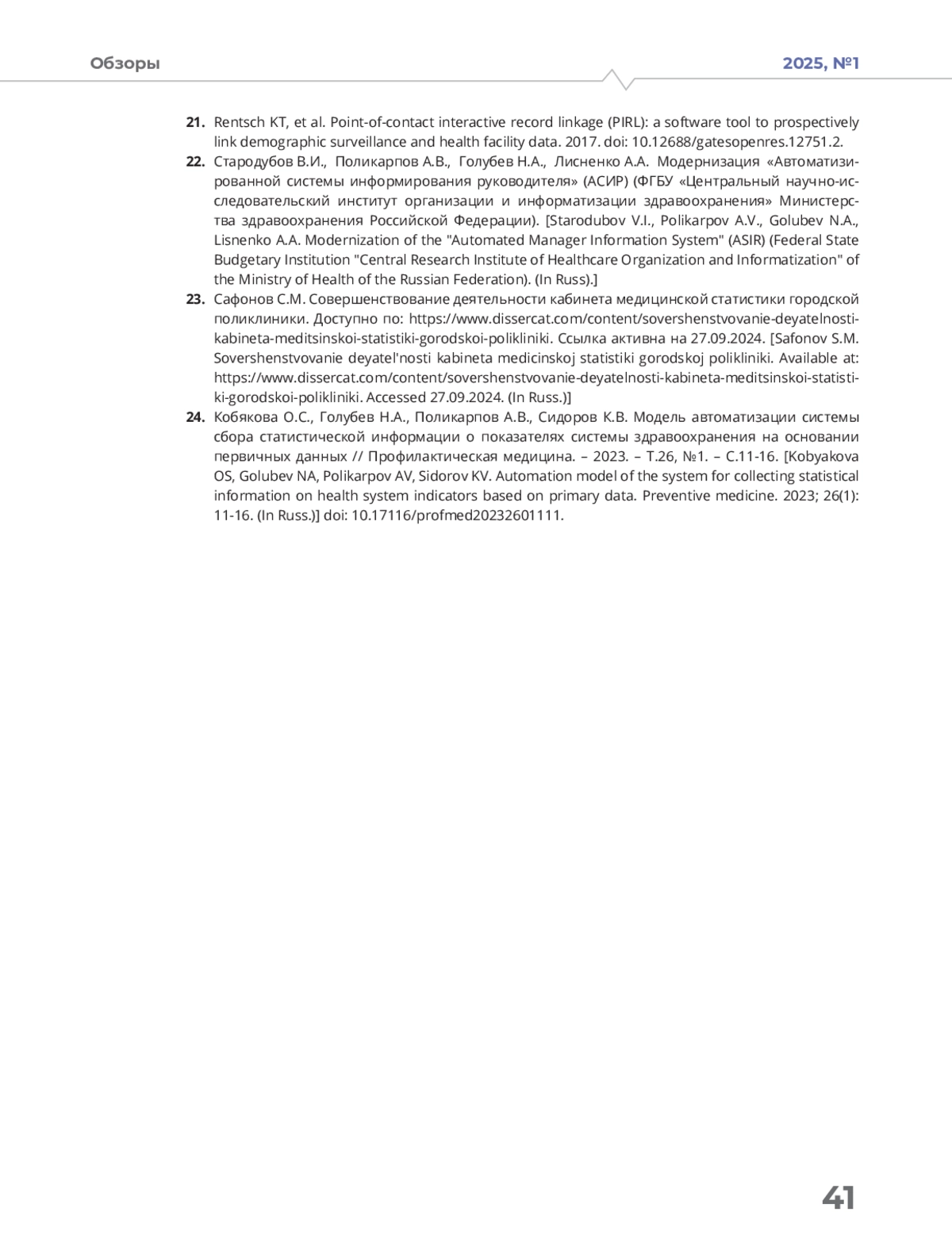 24. Кобякова О.С., Голубев Н.А., Поликарпов А.В., Сидоров К.В. Модель автоматизации системы сбора статистической информации о показателях системы здравоохранения на основании первичных данных // Профилактическая медицина. - 2023. - Т.26, №1. - С.11-16.