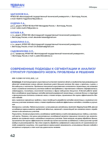 ЦЫГАНКОВ В. А., КУДРИН Р. А., КАТАЕВ А. В., ШАБАЛИНА О. А., САДОВНИКОВА Н. П. СОВРЕМЕННЫЕ ПОДХОДЫ К СЕГМЕНТАЦИИ И АНАЛИЗУ СТРУКТУР ГОЛОВНОГО МОЗГА: ПРОБЛЕМЫ И РЕШЕНИЯ // ВРАЧ И ИНФОРМАЦИОННЫЕ ТЕХНОЛОГИИ. 2025. № 1