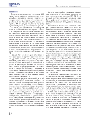 Актуальность. Современные алгоритмы искусственного интеллекта позволяют получать новые знания о потенциальных факторах риска и моделировать инструменты, прогнозирующие хроническое течение заболеваний почек у детей. Управление течением хронической болезни почек (ХБП) основано на использовании инструментов, помогающих врачу своевременно прогнозировать переход от острого заболевания почек к хроническому и своевременно направить ребенка к нефрологу.