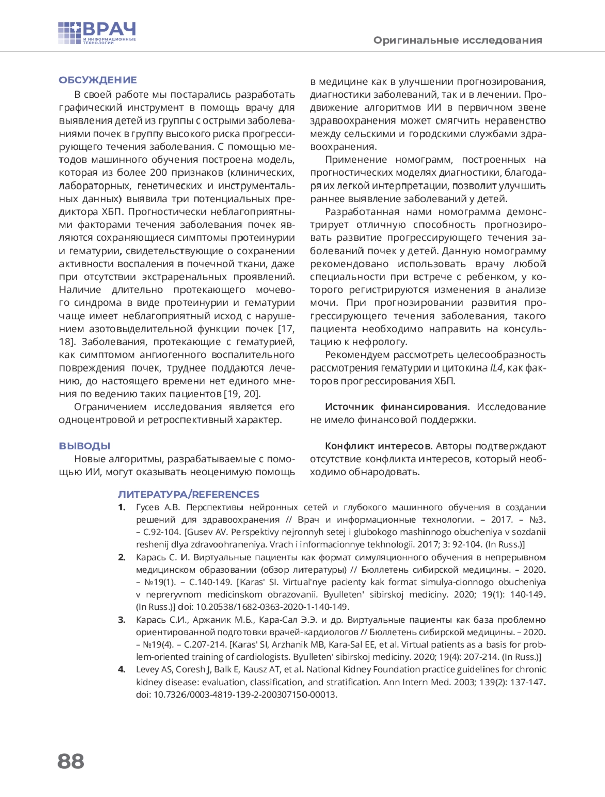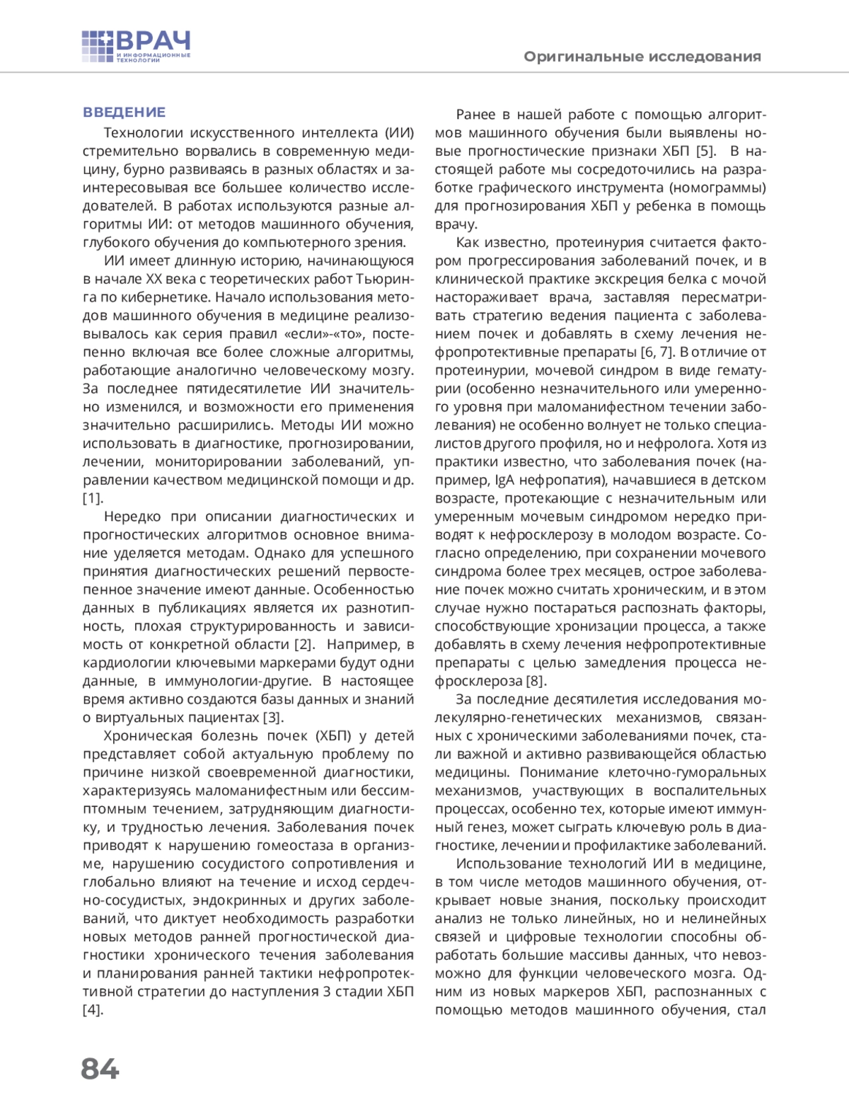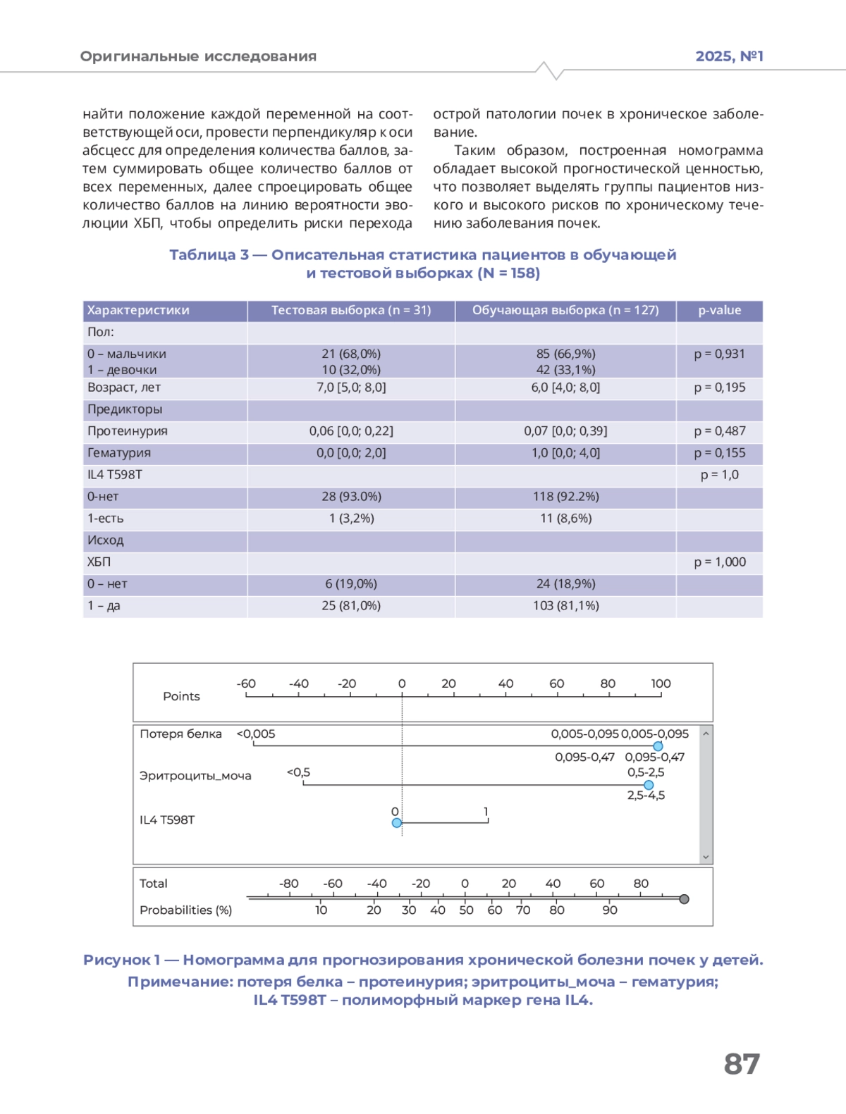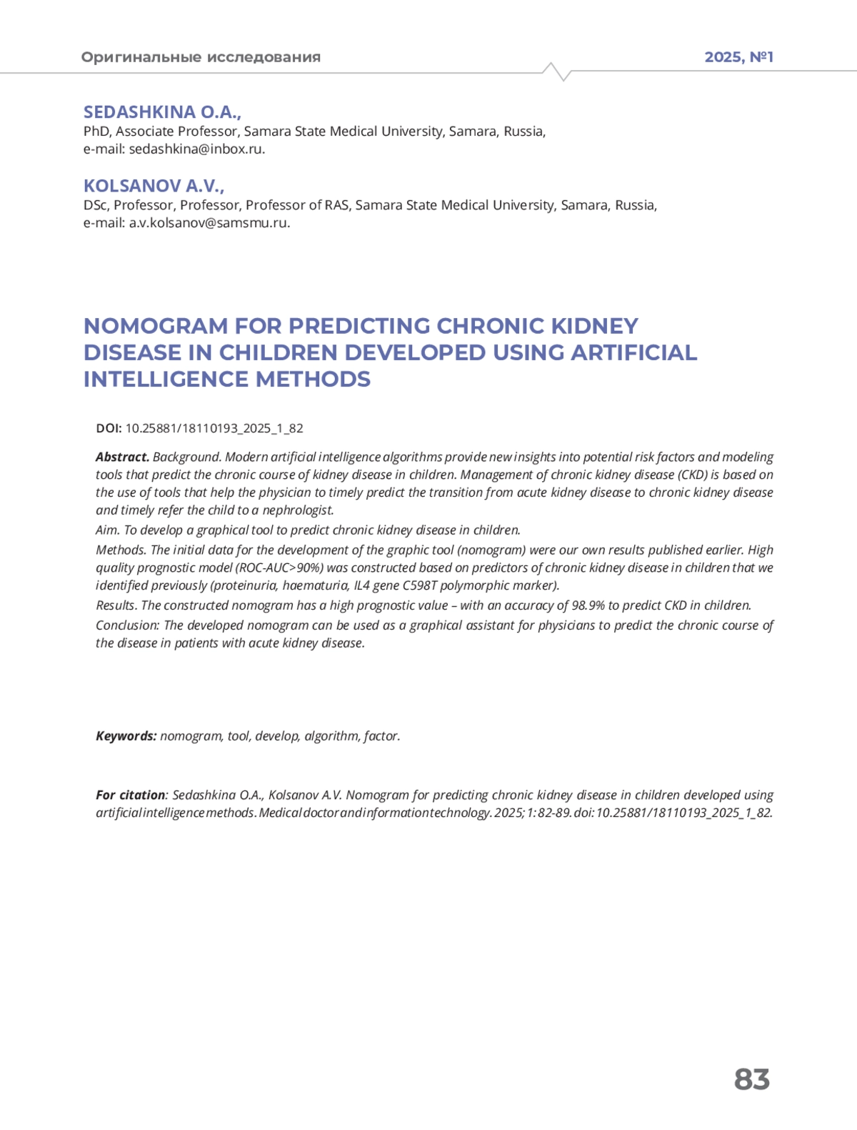 Статья: НОМОГРАММА ДЛЯ ПРОГНОЗИРОВАНИЯ ХРОНИЧЕСКОЙ БОЛЕЗНИ ПОЧЕК У ДЕТЕЙ, РАЗРАБОТАННАЯ С ПОМОЩЬЮ МЕТОДОВ ИСКУССТВЕННОГО ИНТЕЛЛЕКТА (2025)
