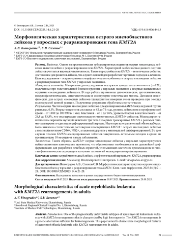 Результаты. Частота острых миелоидных лейкозов с реаранжировками KMT2A в исследуемой группе равнялась 4,1%. Возраст пациентов составлял от 42 до 71 года, уровень лейкоцитов в периферической крови – от 1480 до 100 690 в 1 мкл, бластемия – от 0 до 96%, уровень бластов в костном мозге – от 26,8 до 93,8%, что подтверждает значительную гетерогенность KMT2A+ лейкозов. Молекулярно-генетические варианты мутаций включали три типа химерных транскриптов KMT2A с разными генами-партнерами и один неспецифицированный вариант. Несмотря на ограниченный объем выборки, была выявлена статистически достоверная кластеризация KMT2A+ острых миелоидных лейкозов с иммунофенотипом CD56+, NG2+, а также в подгруппе с минимальной дифференцировкой. Во всех случаях течение KMT2A-ассоциированных лейкозов завершилось летальным исходом в сроки, не превышающие 10 месяцев от начала заболевания.