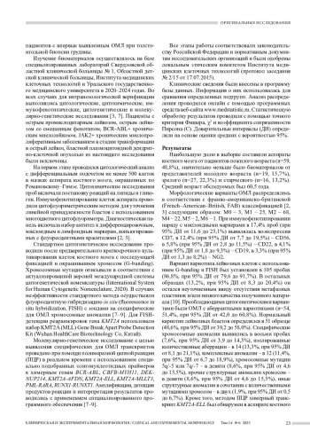 Материалы и методы. Материалом для исследования послужили аспираты костного мозга (n=121), полученные при толстоигольной биопсии грудины у взрослых пациентов с впервые выявленными острыми миелоидными лейкозами. В ходе работы применены цитологические, цитохимические, иммунофенотипические, цитогенетические и молекулярно-генетические методы. Детекция специфических для острых миелодных лейкозов транскриптов химерных генов проведена при помощи полимеразной цепной реакции. Полученные результаты обработаны статистически.