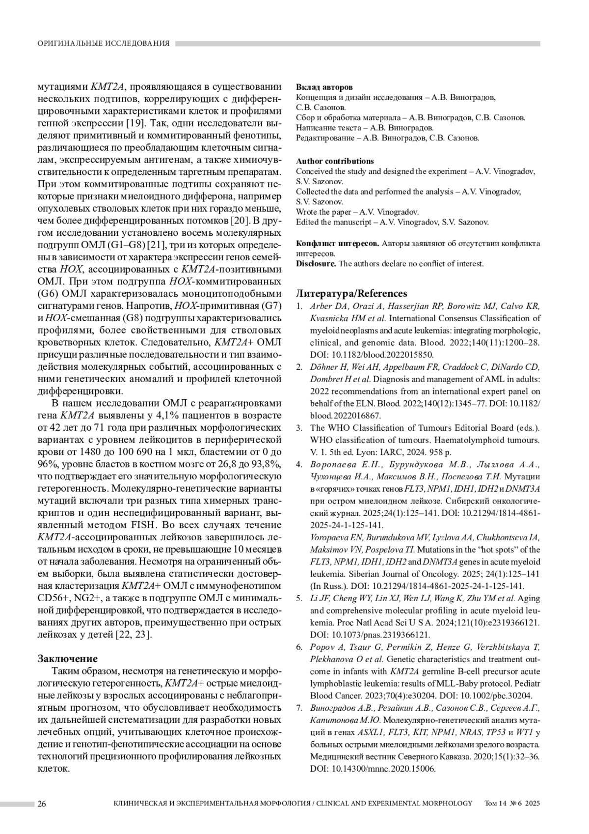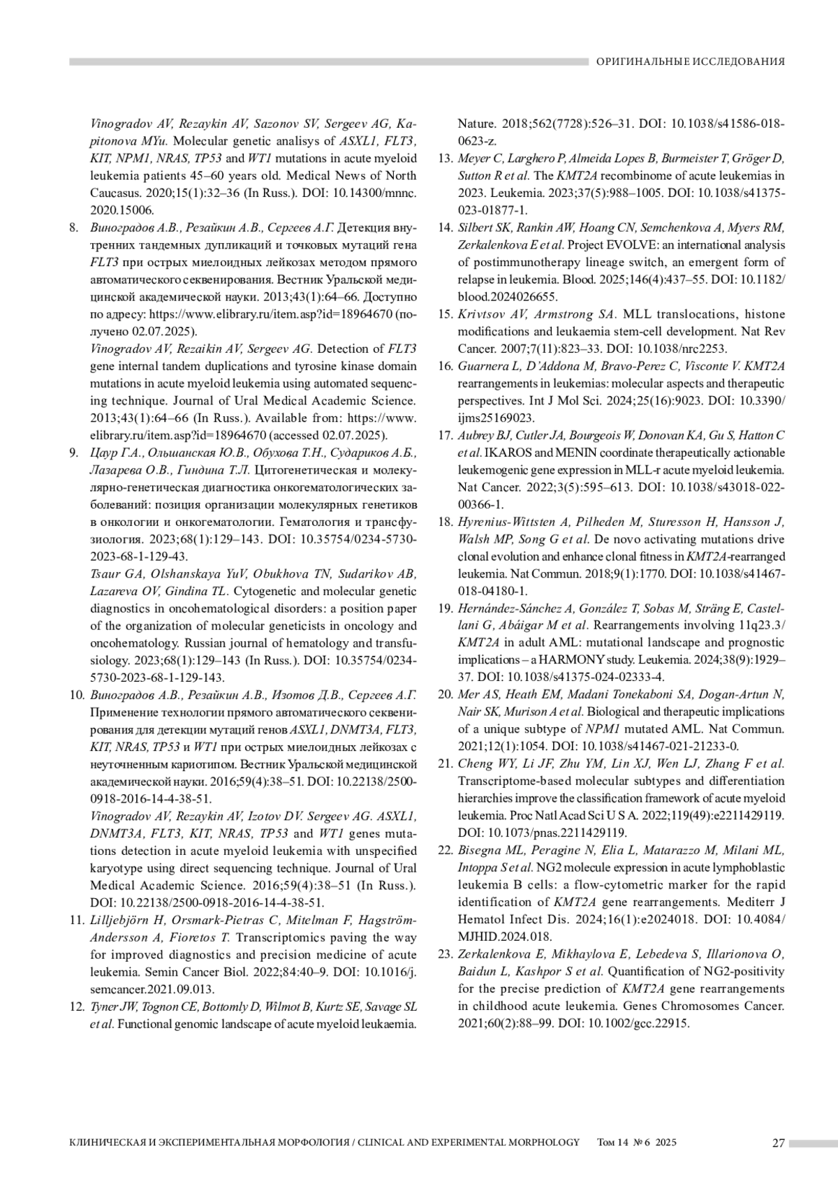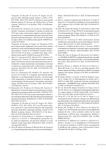 Заключение. Таким образом, KMT2A+ острые миелоидные лейкозы у взрослых характеризуются неблагоприятным клиническим прогнозом, что обусловливает необходимость их дальнейшей дифференциации для разработки лечебных стратегий, учитывающих клеточное происхождение и генотип-фенотипические ассоциации на основе технологий молекулярного профилирования.