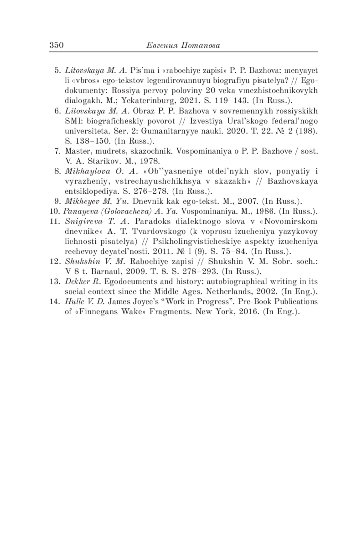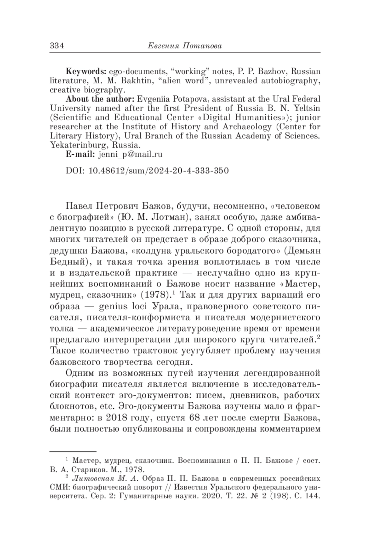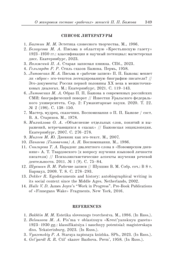 ПОТАПОВА Е. В. «НАДО ПРИСЛУШАТЬСЯ И КОЙ-КАКИЕ СЛОВА ИГРОВЫЕ ЗАПИСАТЬ»: О ЖАНРОВОМ СОСТАВЕ НЕОПУБЛИКОВАННЫХ «РАБОЧИХ» ЗАПИСЕЙ П. П. БАЖОВА // ЛЕТНЯЯ ШКОЛА ПО РУССКОЙ ЛИТЕРАТУРЕ. 2024. № 4, ТОМ 20