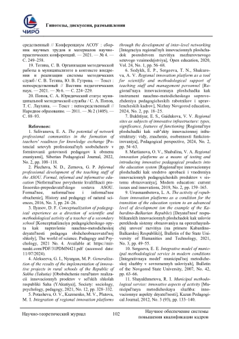 19. Тетина, С. В. Организация методической работы в муниципалитете в контексте внедрения и реализации системы методических служб / С. В. Тетина, Ю. В. Гутрова. - Текст: непосредственный // Вестник педагогических наук. - 2021. - № 6. - С. 224-229. EDN: GFEKZO